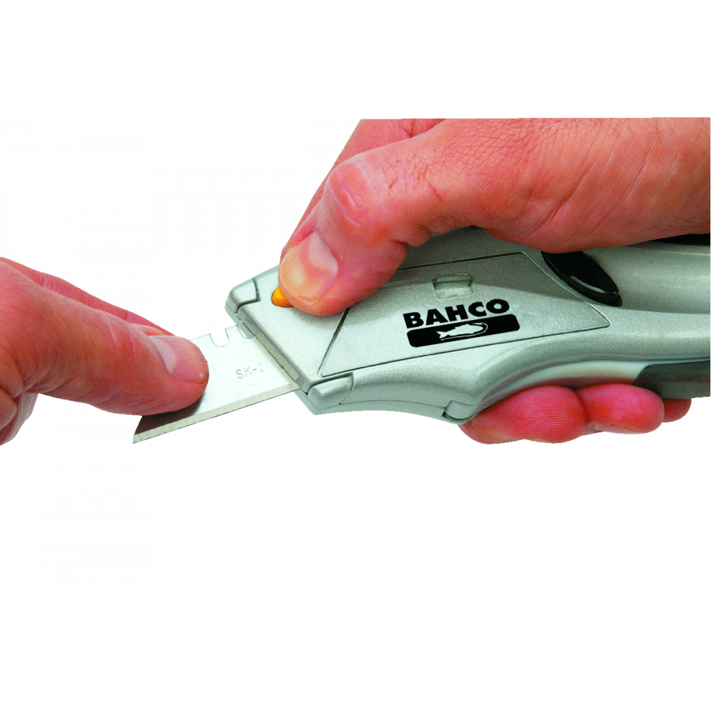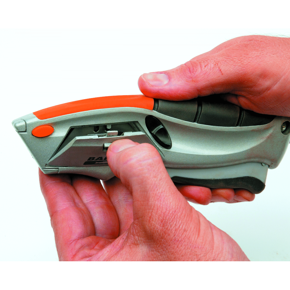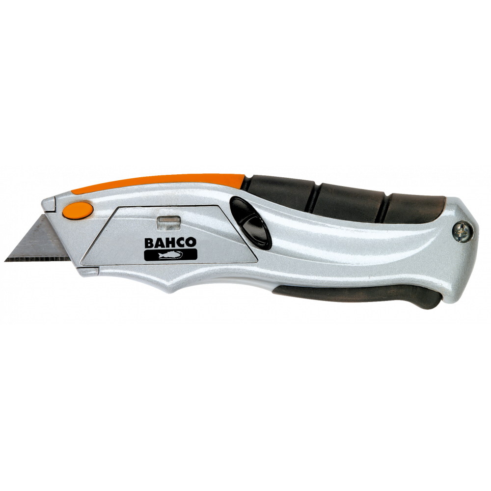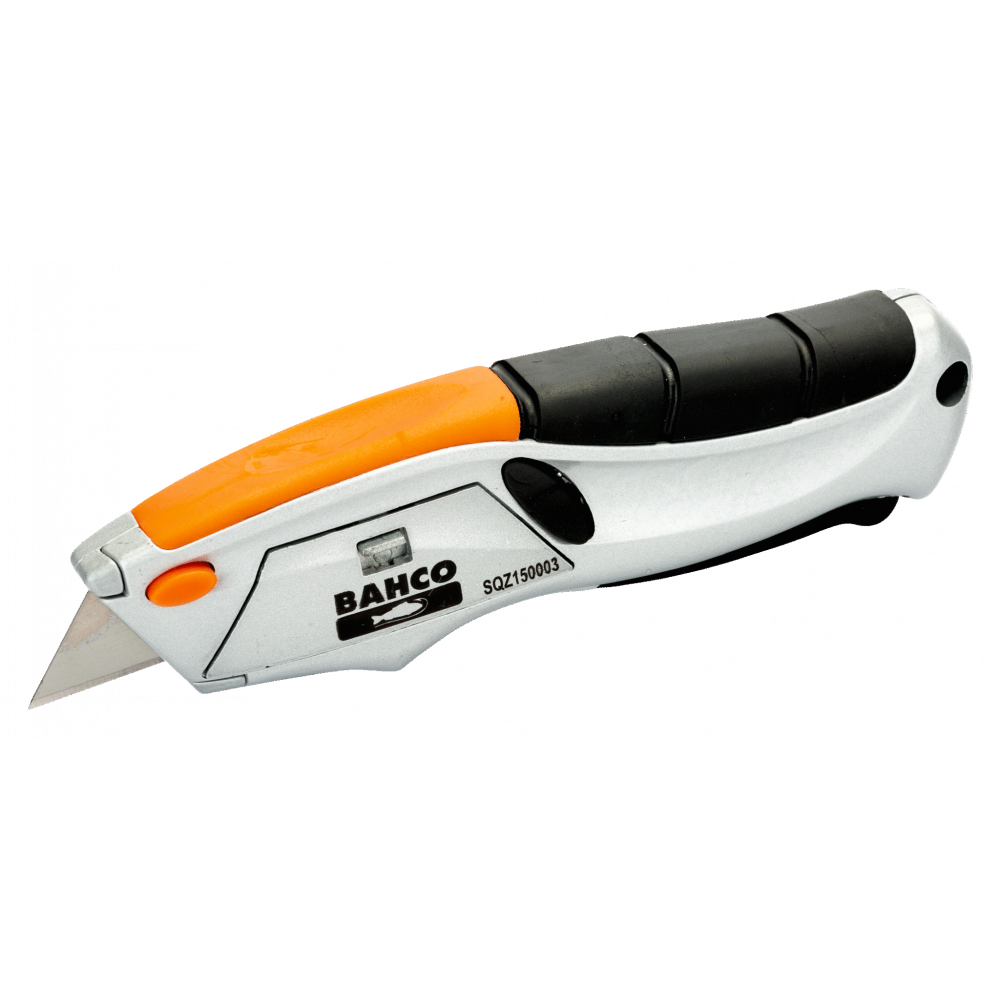 Stláčací, zaťahovací, úžitkový nož s gumenou rukoväťou.