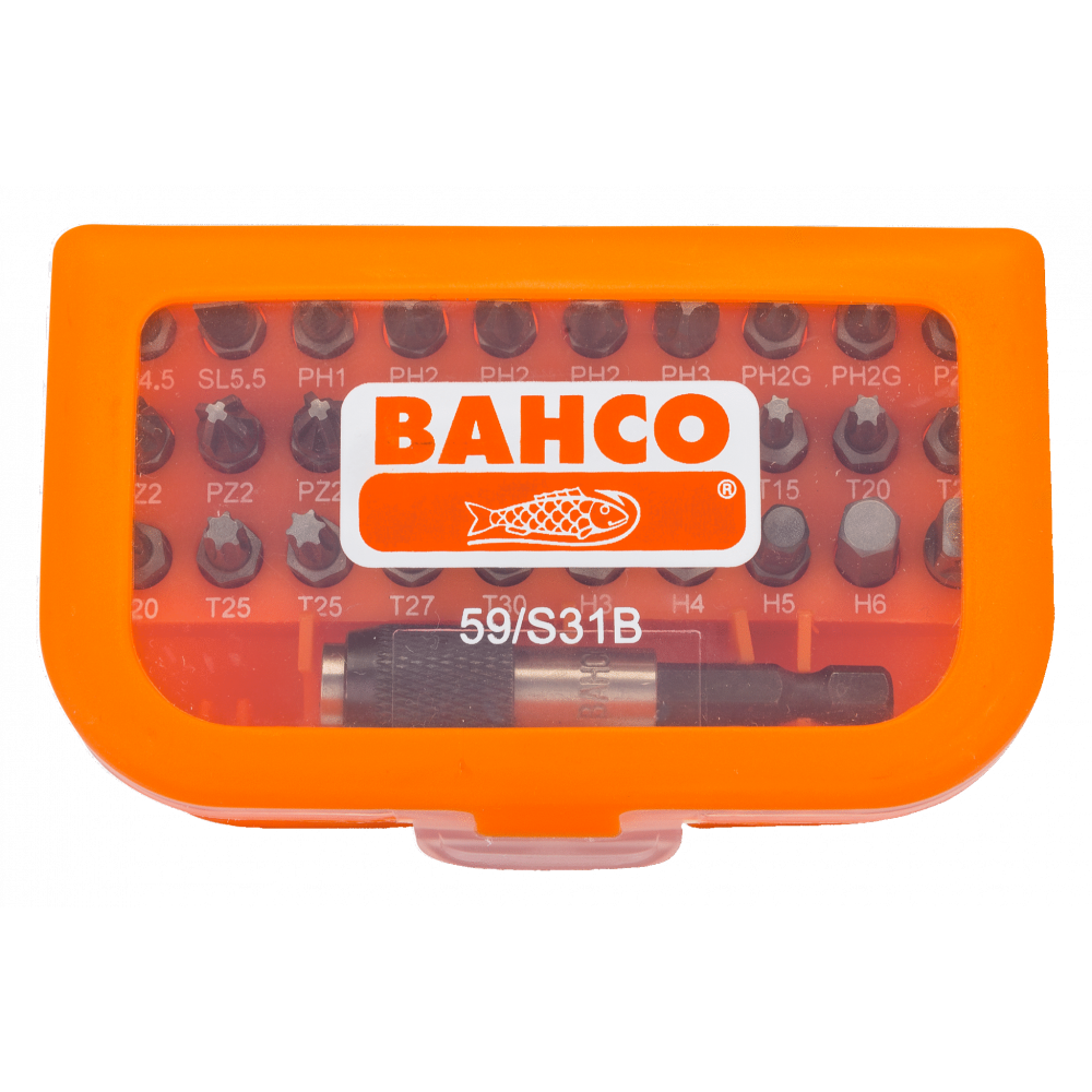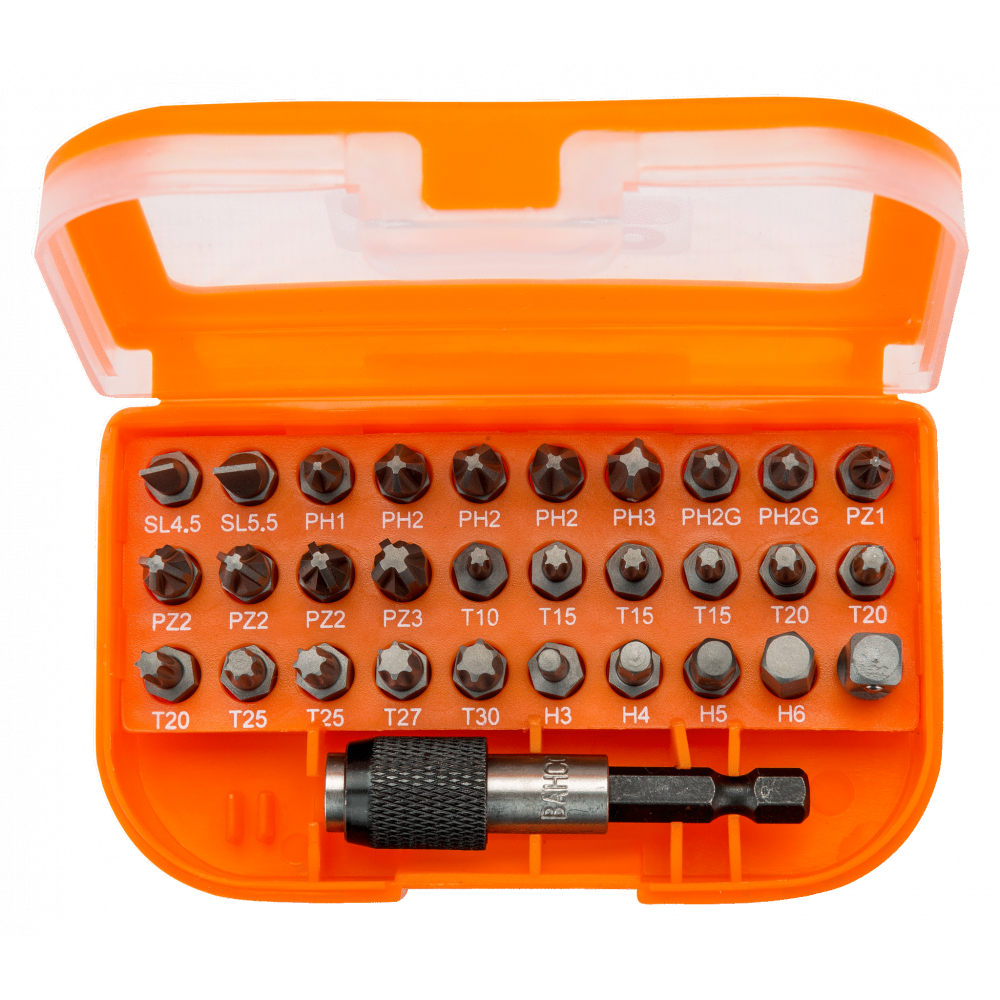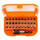 31-dielna sada bitov na skrutky s rovnou drážkou, drážkou Phillips, Pozidriv, TORX® , šesťhran, držiakom bitov a adaptér 1/4".