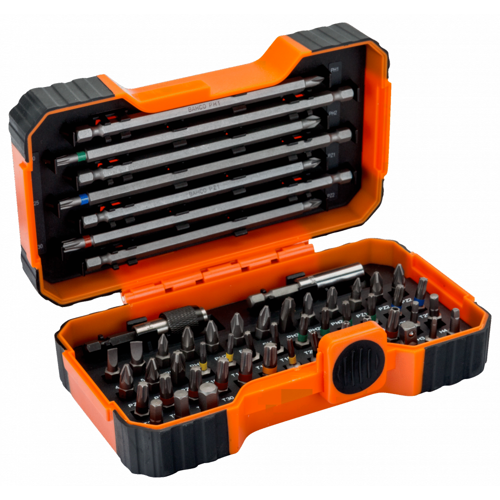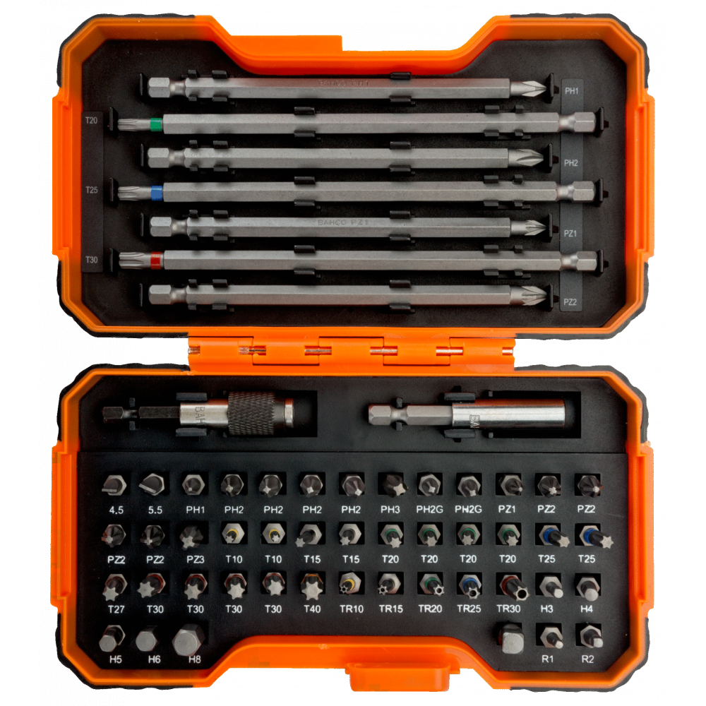 Sada 54ks bitov na skrutky s rovnou drážkou, drážkami Phillips, Pozidriv, vnútorným šesťhranom, drážkou Robertson a farebné na skrutky s drážkou TORX®, TORX® s poistným kolíkom