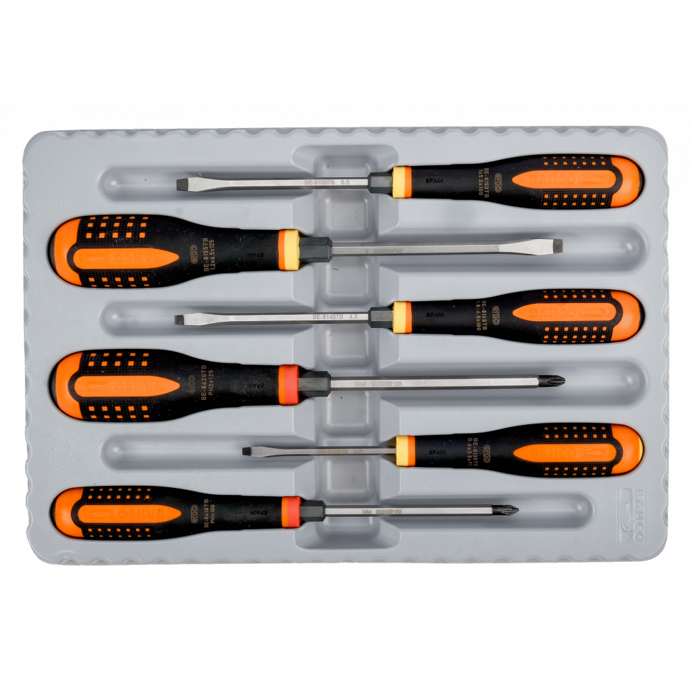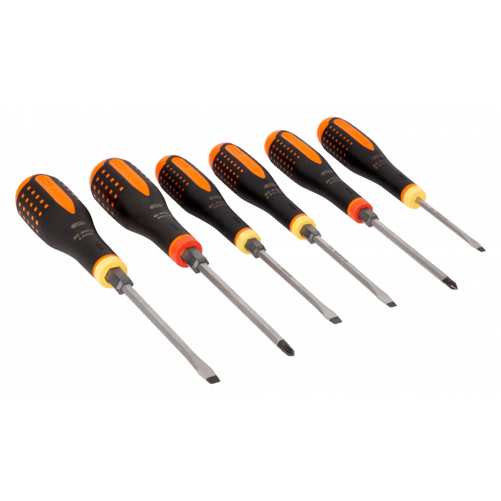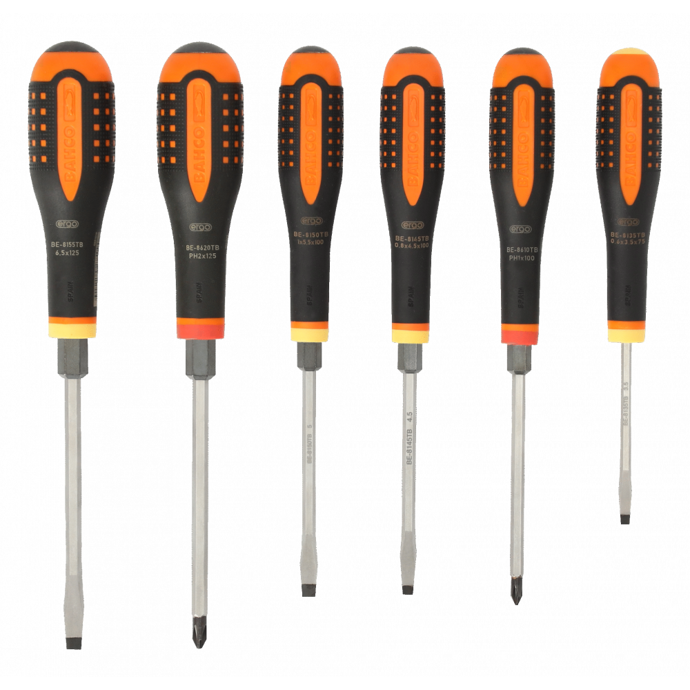 Sada ERGO™ skrutkovačov s priechodnou čepeľou. Pre skrutky s rovnou drážkou a krížovou drážkou Phillips, šesťhranný driek.