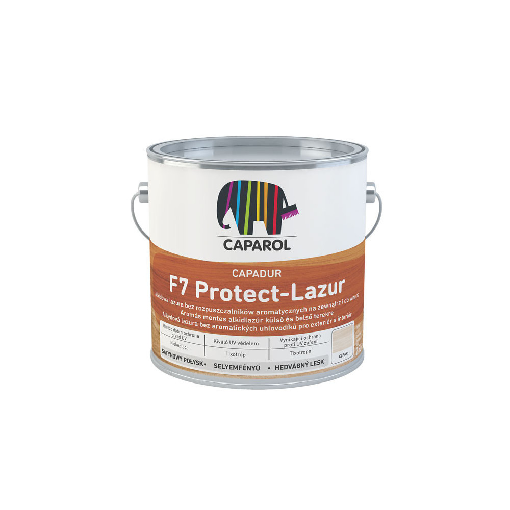 Caparol Capadur F7-ProtectLazur je lazúra na drevo s vysokou odolnosťou voči poveternostným vplyvom a zvýšenou ochranou proti UV žiareniu do vonkajších aj vnútorných priestorov. Bez obsahu aromatických uhlovodíkov. Stredná hrúbka náteru.