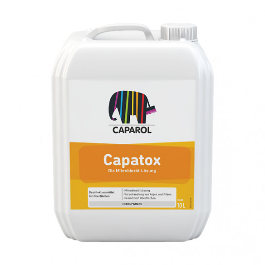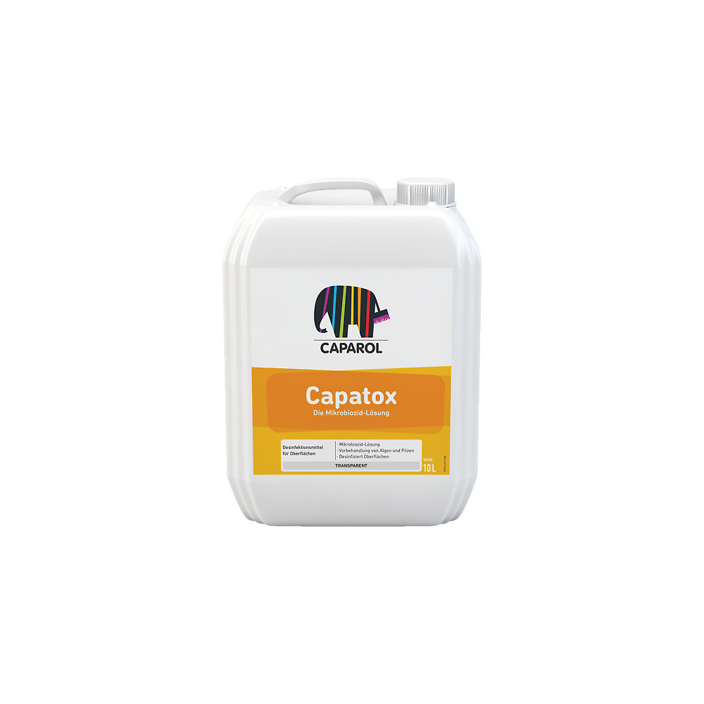 Použitie: Vodný mikrobiocídny roztok na uľahčenie čistenia miest, napadnutých riasami, machmi a plesňami, vo vonkajších i vnútorných priestoroch pred následnými úpravami plôch. Prípravok Capatox je pripravený na priame použitie.