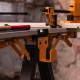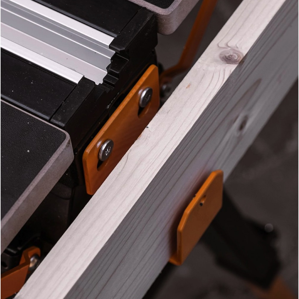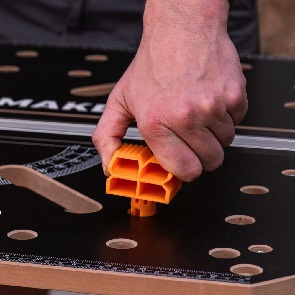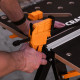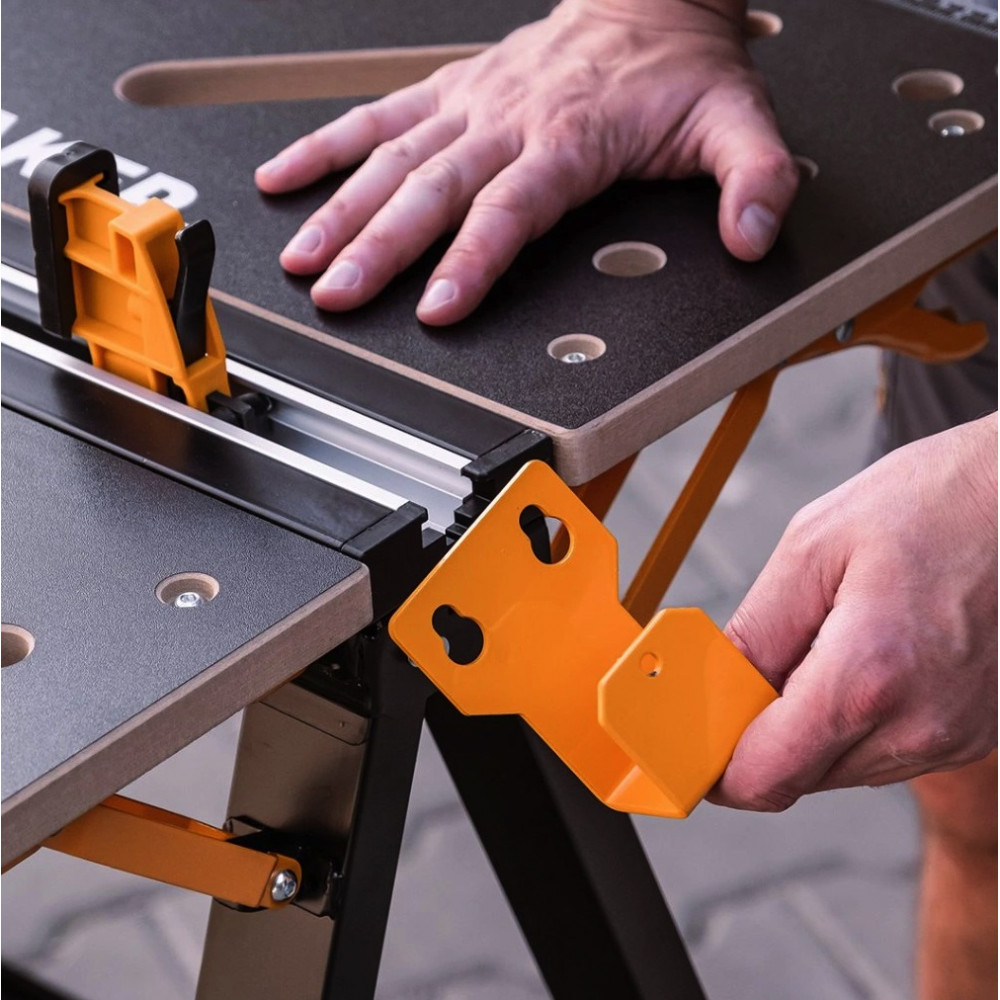 Pracovný stôl CRAFTMAKER®, ktorý za chvíľku premeníte na stavebnú kozu. FoldStation S20 toho zvládne ale oveľa viac. Nohy výškovo nastavíte pomocou kovovej poistky. Na pevnej MDF pracovnej doske oceníte múdro rozmiestnené otvory pre plastové zarážky - Bench Dogy, ktoré sú súčasťou balenia. K stolíku tiež patrí jednoručná svorka, ktorú je možné pripevniť do hliníkovej lišty uprostred. Pomocou pružného pásika spojíte niekoľko stolov FoldStation S20 dohromady. Na zväčšenie pracovnej plochy môžete tiež využiť bočné háky pre hranoly, na ktoré usadíte drevenú dosku.
