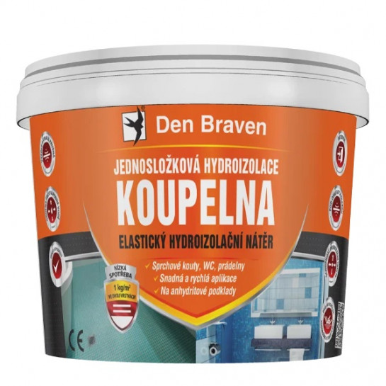DEN BRAVEN kúpelna hydroizolácia je hotová jednozložková, polotekutá hmota s tixotropnými vlastnosťami na báze polymérovej disperzie. Po zaschnutí hmoty sa vytvorí vysoko elastický, tesný, vodoodolný náter s dobrou priľnavosťou k podkladu. Neobsahuje organické látky.