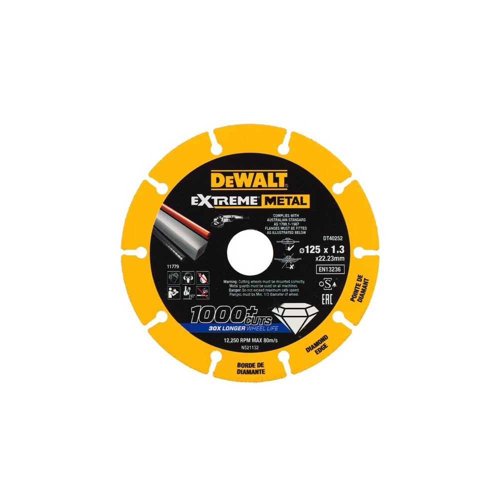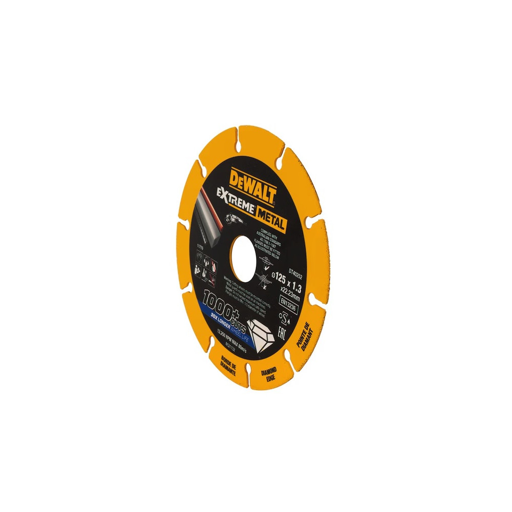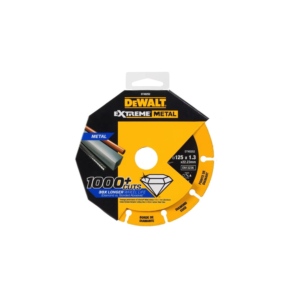 Rezné kotúče EXTREME METAL sú vybavené diamantovou technológiou pre extrémnu odolnosť a maximálnu efektivitu práce. Poskytujú viac ako 1 000 rezov, čo je 30-krát dlhšie ako tenké lepené rezacie kotúče. Veľkosť 125 x 22,23 x 1,3 mm, na použitie s uhlovou brúskou.