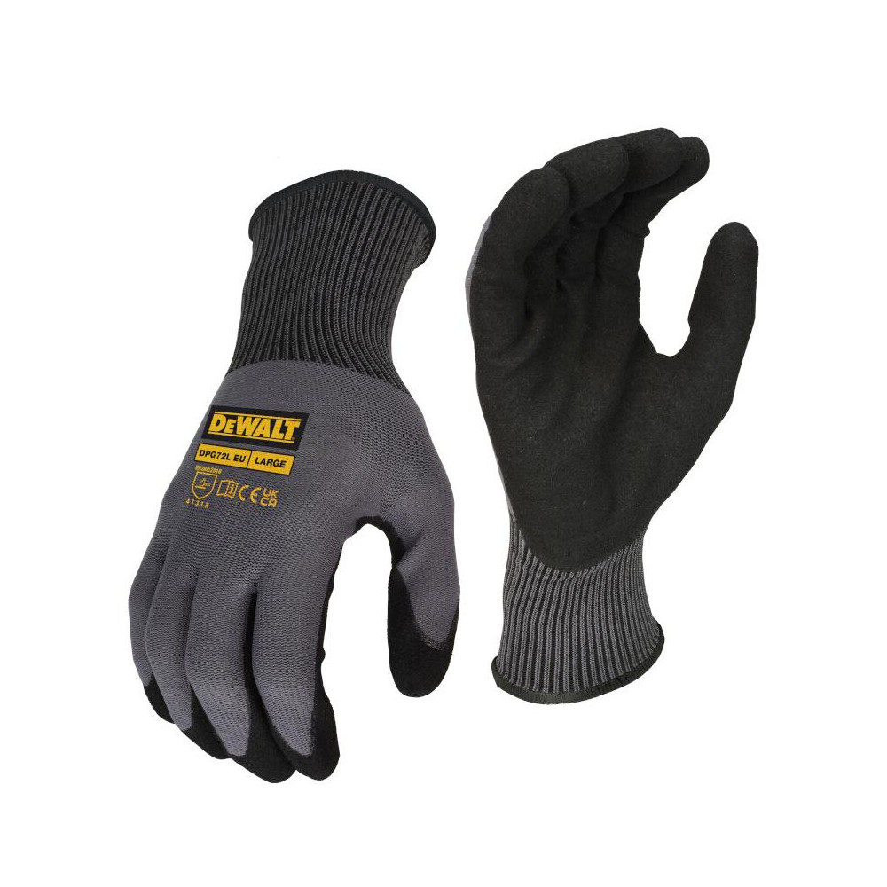 Pracovné rukavice DEWALT DPG72 sú vyrobené z 13-g polyamidového (nylonového) úpletu a vybavené dvojitým povrstvením Flexible Durable Grip, ktoré poskytuje vynikajúci protišmykový úchop, vysokú odolnosť proti oderu a dlhú životnosť.