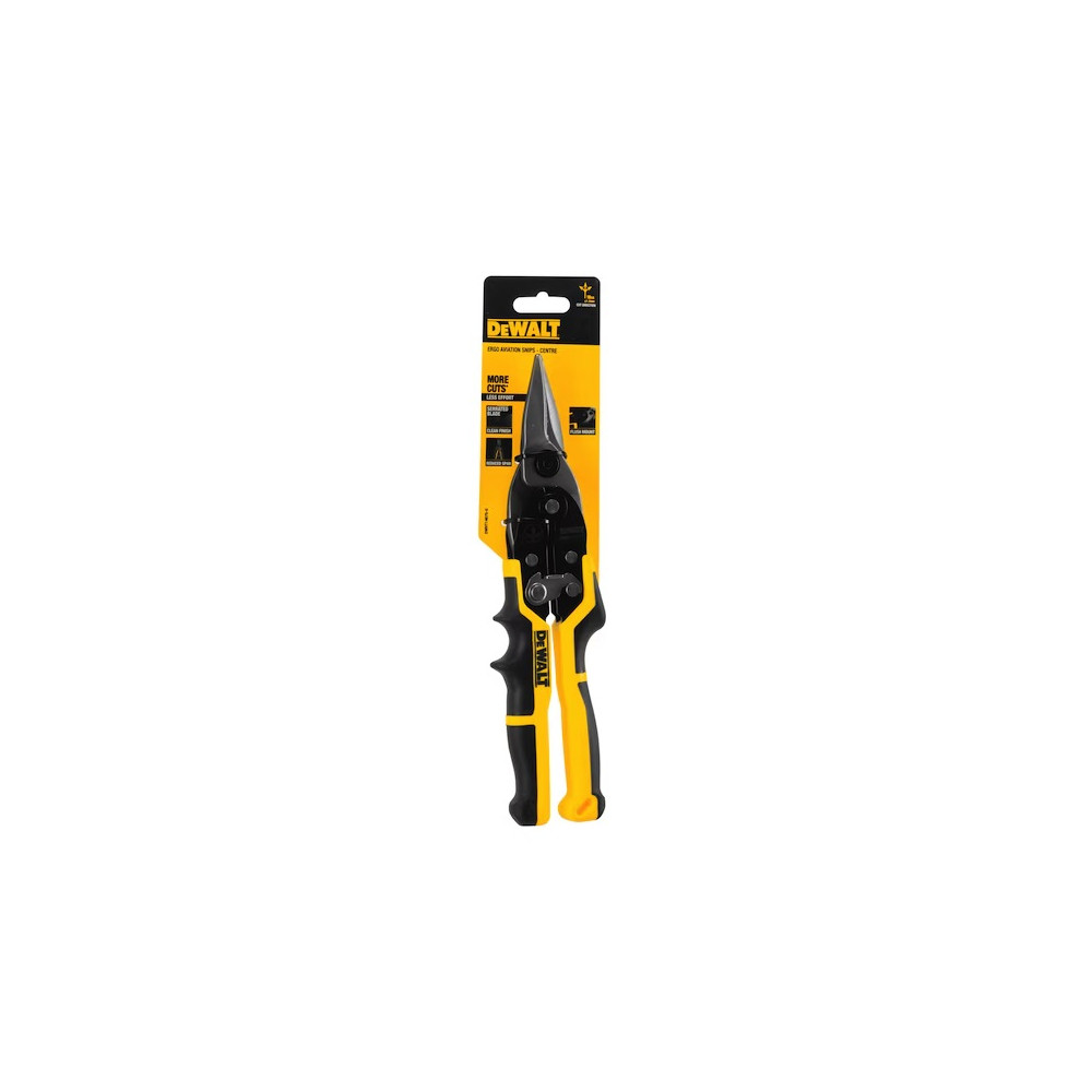 DEWALT® Ergo Aviation Snip bol navrhnutý so zníženým rozpätím rukoväte, čo poskytuje nižšiu úroveň svalovej námahy potrebnej pri rezaní tvrdých materiálov. Tento nástroj sa tradične používa na rezanie hliníka, vinylových obkladov, tienenia, kartónu, kože, medi a plechu hrúbky 18 až 22. Zúbkovaná rezná hrana nožnice zabraňuje skĺznutiu materiálov počas používania a protišmyková dvojmateriálová podušková rukoväť zaisťuje pevné a pohodlné uchopenie.