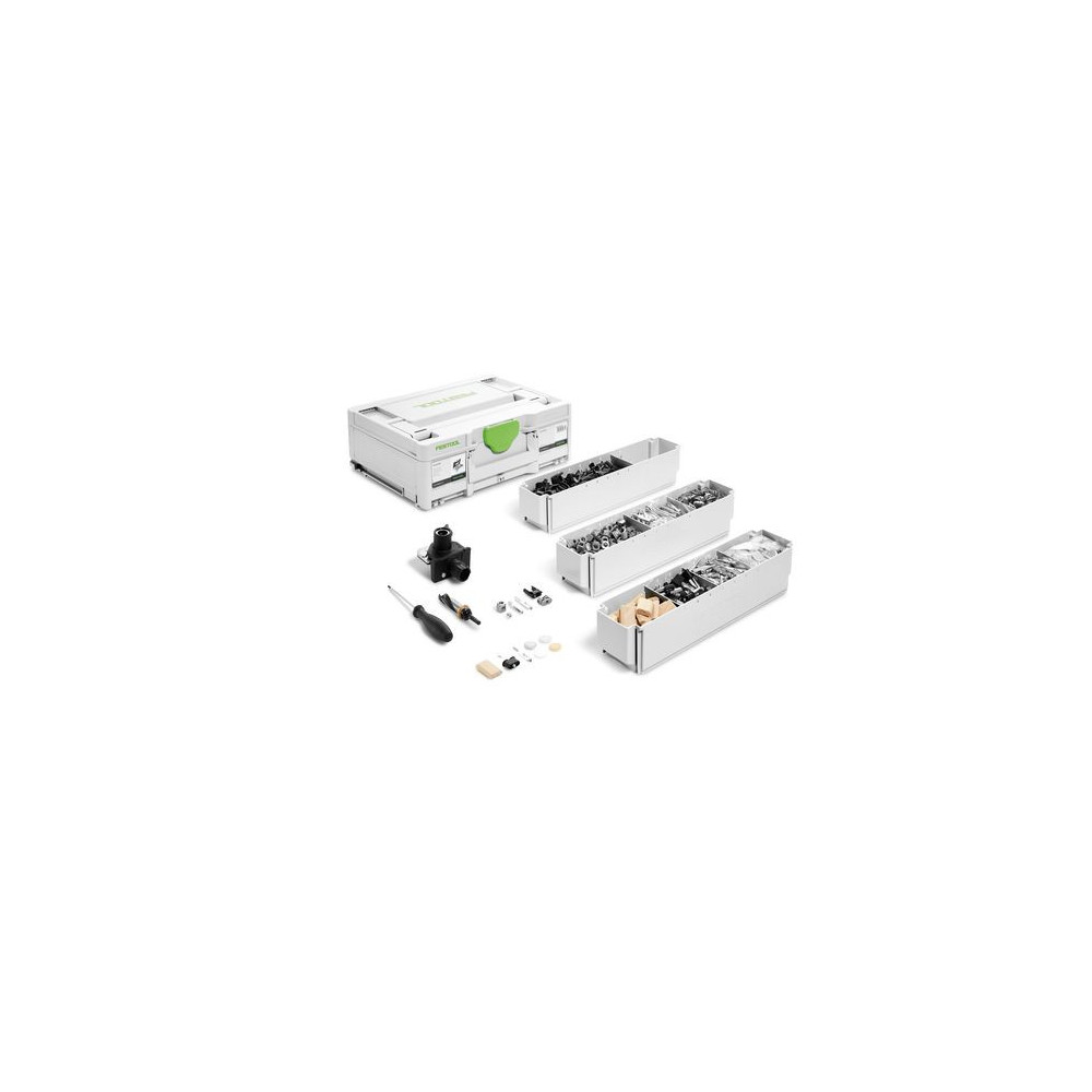 Korpusová spojka DOMINO/DOMINO KV D8, Korpusová spojka DOMINO/LR32 KV-LR32 D8, Spojky stredných strán DOMINO/DOMINO MSV D8, Spojky stredných strán DOMINO/LR32 MSV-LR32 D8, 50 krytiek tmavohnedých KV-AK D15 brn, 50 krytiek strieborných KV-AK D15 slr, 50 krytiek bielych KV-AK D15 wht, 50 krytiek sivých KV-AK D15 gr, DOMINO D 8 x 36 mm, Vŕtacia šablóna BS-KV D15, Vrták na kovanie KVB-HW D15 CE, Skrutkovač, Systainer SYS3 M 137, v kartónovom obale