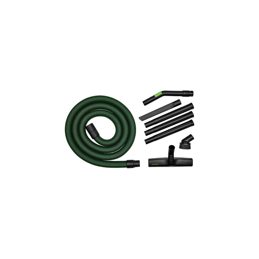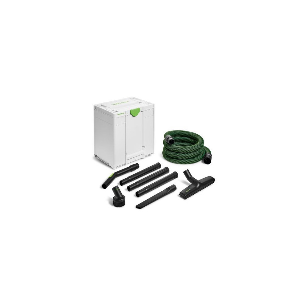 zahnutá ručná trubica D 36 HR-K AS, podlahová hubica D 36 BD 300, Predlžovacia trubica D 36 VR-K AS, štrbinová hubica D 36 FD-300, kefa v tvare štetca D 36 SP, nasávacia hadica hladká D 36 x 3,5 m antistatická, Systainer SYS3 M 437, v kartónovom obale