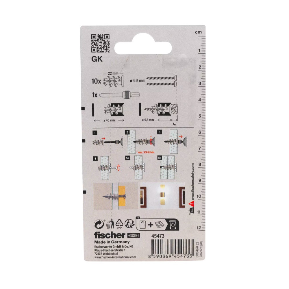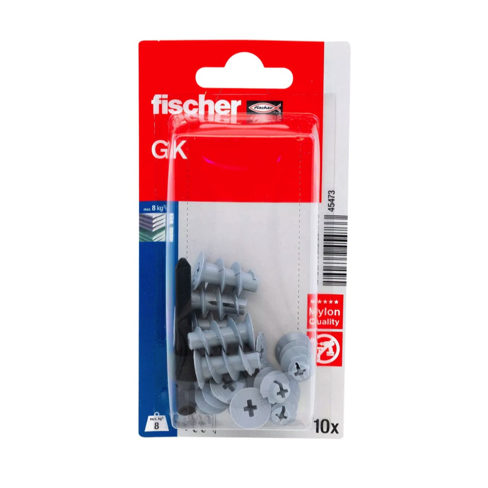 Fischer hmoždinka do sadrokartónu GK je vyrobená z kvalitného nylonu. Je vhodná pre predsadenú montáž. Pri osadzovaní do roviny s povrchom sadrokartónu sa použije priložený montážny prípravok upnutý do aku skrutkovača. Pred osadením hmoždinky do dosky do hrúbky 15 mm nie je nutné prevrtávať otvor. Hmoždinkou fischer GK je možné bezpečne upevniť drevené lišty, kovové plechy a pod. pomocou skrutky do dreva priemeru 4 - 5 mm alebo obrázky, svietidlá a elektroinštalácie pomocou skôb, hákov či ôk.