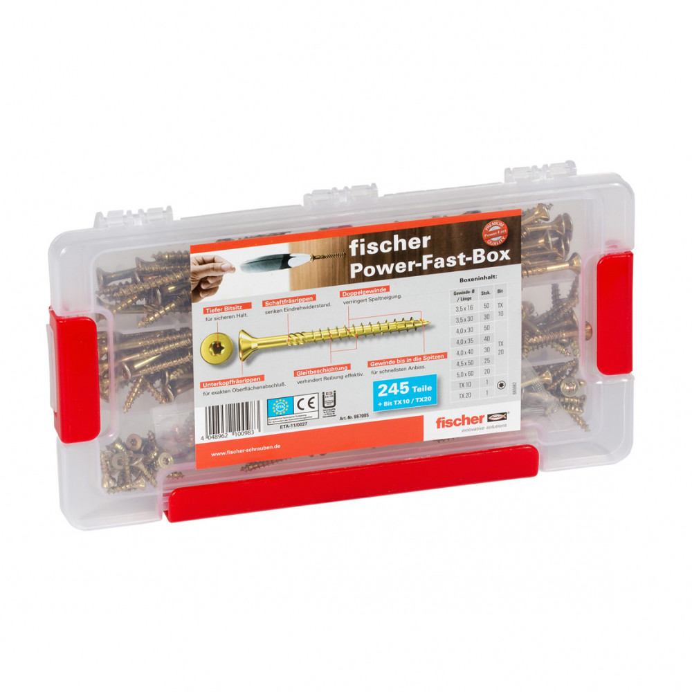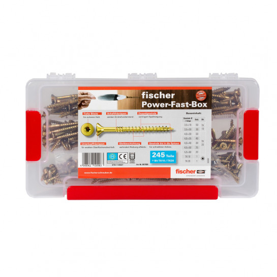 Fischer Power-Fast-Box je kolekcia Fischer skrutiek do dreva Power-Fast so zapustenou hlavou, s drážkou Torx TX a čiastočným alebo celým závitom. Skrutky sú uložené v praktickom boxe.