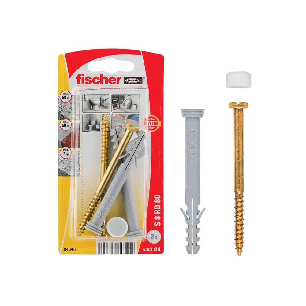 Fischer upevňovacia sada WC S 8 RD 80 K obsahuje všetky prvky pre bezpečné upevnenie voľne stojacich klozetov. Dve fischer hmoždinky RD 60 z kvalitného nylonu, dve mosadzné šróby 6 x 85 so šesťhrannou hlavou, dve chromové krytky a dve biele krytky.