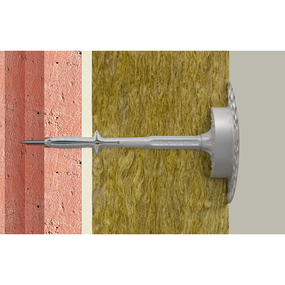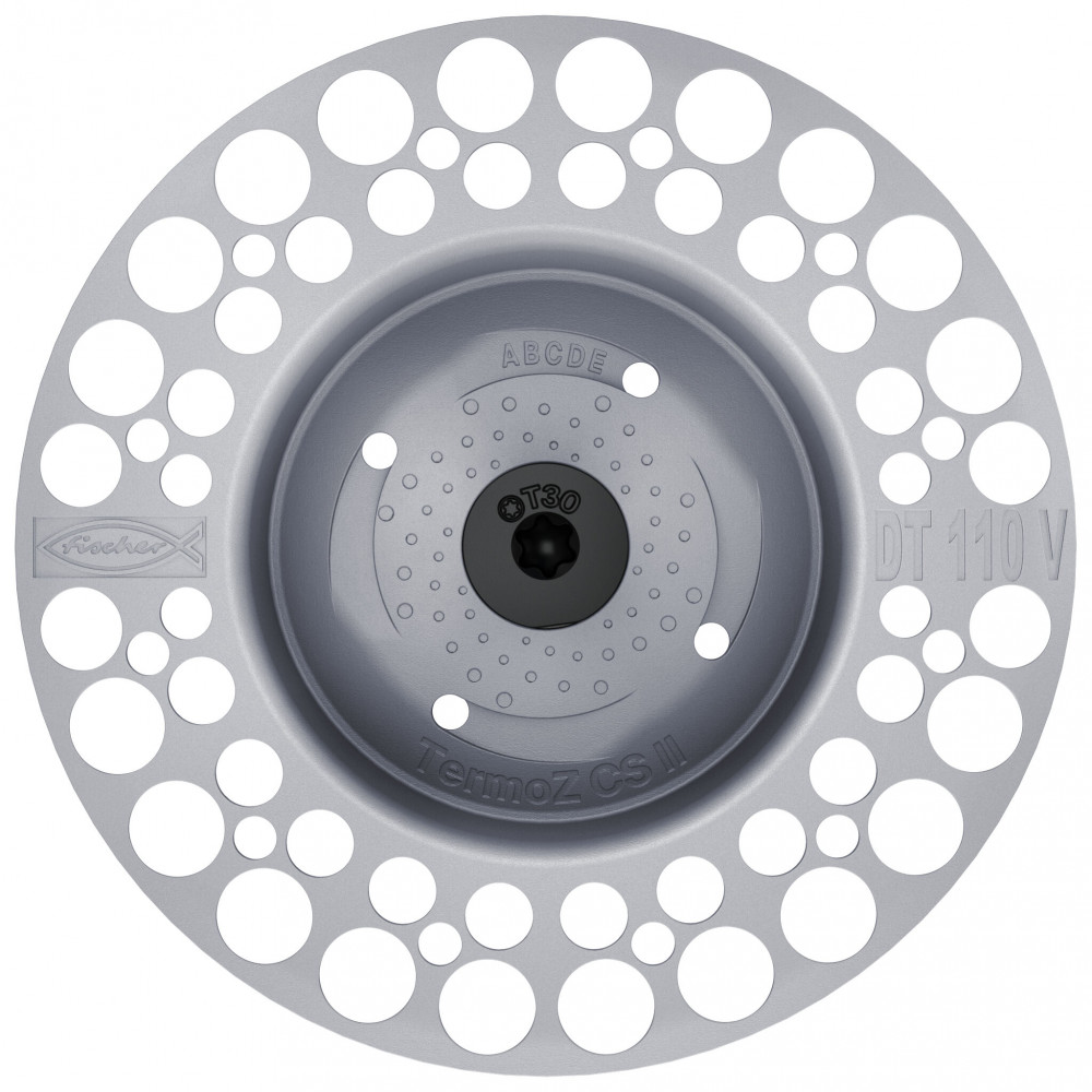 Fischer Termoz CS 8 DT 110V je špeciálna tanierová hmoždinka určená na upevnenie mäkkých tepelných izolantov na betón, plné i dierované murivo, pórobetón a ľahčený betón v súlade s Európskym certifikátom. Kotva sa skladá z plášťa, špeciálneho taniera s priemerom 110 mm a materiálovo kombinovanej skrutky. Táto špeciálna kombinácia predchádza vzniku problémových škvŕn na finálnej fasáde. Termoz CS 8 DT 110V je určená pre zápustnú montáž, ktorá sa robí pomocou AKU skrutkovačky. Po montáži sa zapustená časť hmoždinky zakryje viečkom. Tým je povrch izolantu pripravený na brúsenie a stierkovanie.