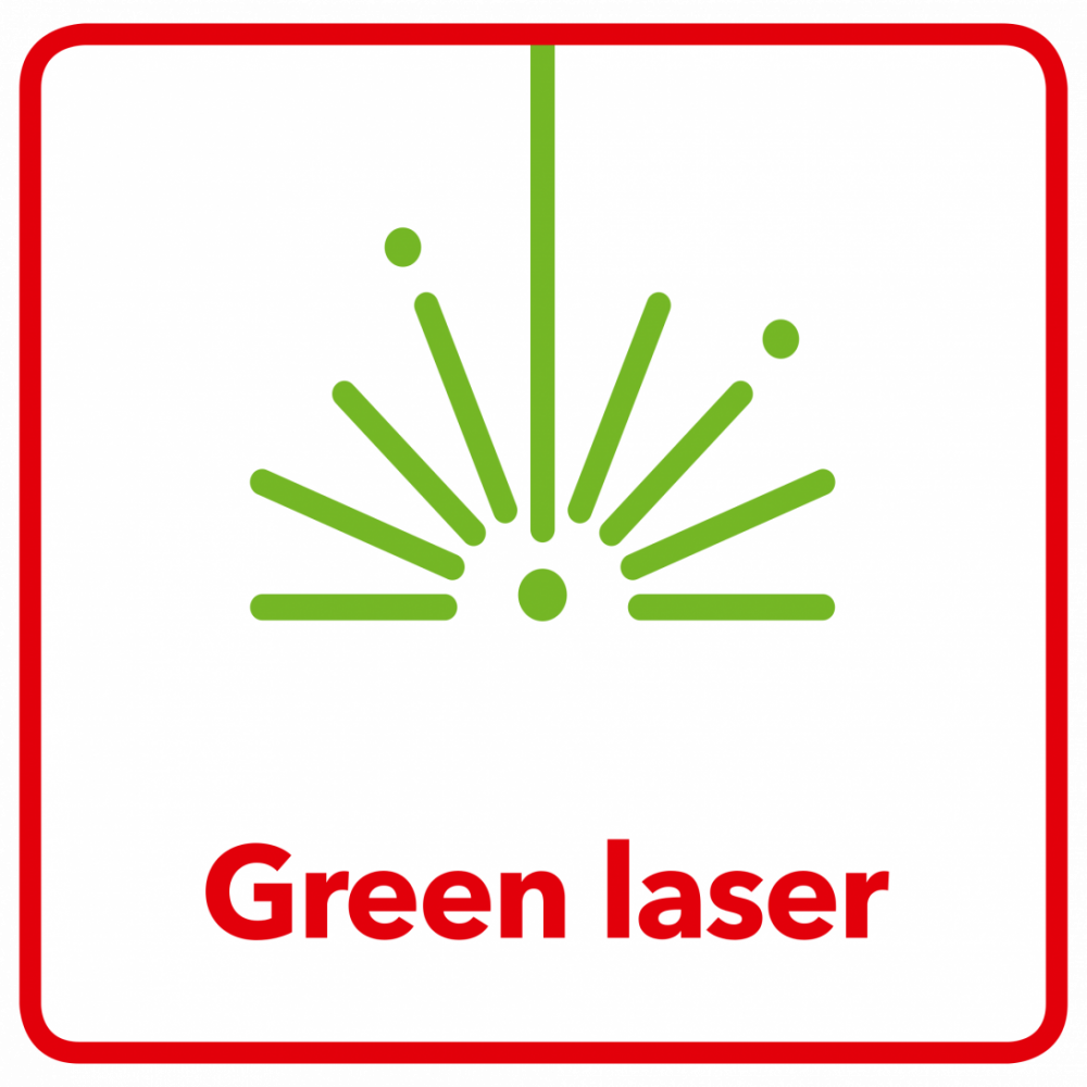 Laserový měřič vzdáleností, Zelená laserová dioda, Zelená laserová linka je jasnější v zobrazení a lépe čitelnější i za zhoršených světelných podmínek., Výpočty délek, ploch a objemů, Určování hodnot pomocí nepřímého měření vzdáleností (jednoduchá i dvojí Pythagorova věta), Rychlé stanovení rozměrů na všech stavbách, Jednoduchá obsluha, Funkce pro malíře, automatické sčítání hodnot jednotlivých ploch se stejnou výškou, Trvalé měření úhlu pro kontrolu polohy měření, Kontinuální měření, Přepínatelné jednotky měření m/mm, palce/stopy, 3 referenční body, Funkce minimum / maximum, Funkce uložení až 99 naměřených hodnot, Automatické vypnutí, Podsvícený, čtyřřádkový displej, Ochranný obal proti prachu a stříkající vodě, Variabilní napájení, provoz možný s bateriemi AAA 1,5 V nebo s dobíjecím akumulátoremi, včetně nabíjecího kabelu micro-USB, ¼” závit pro připojení na stativ