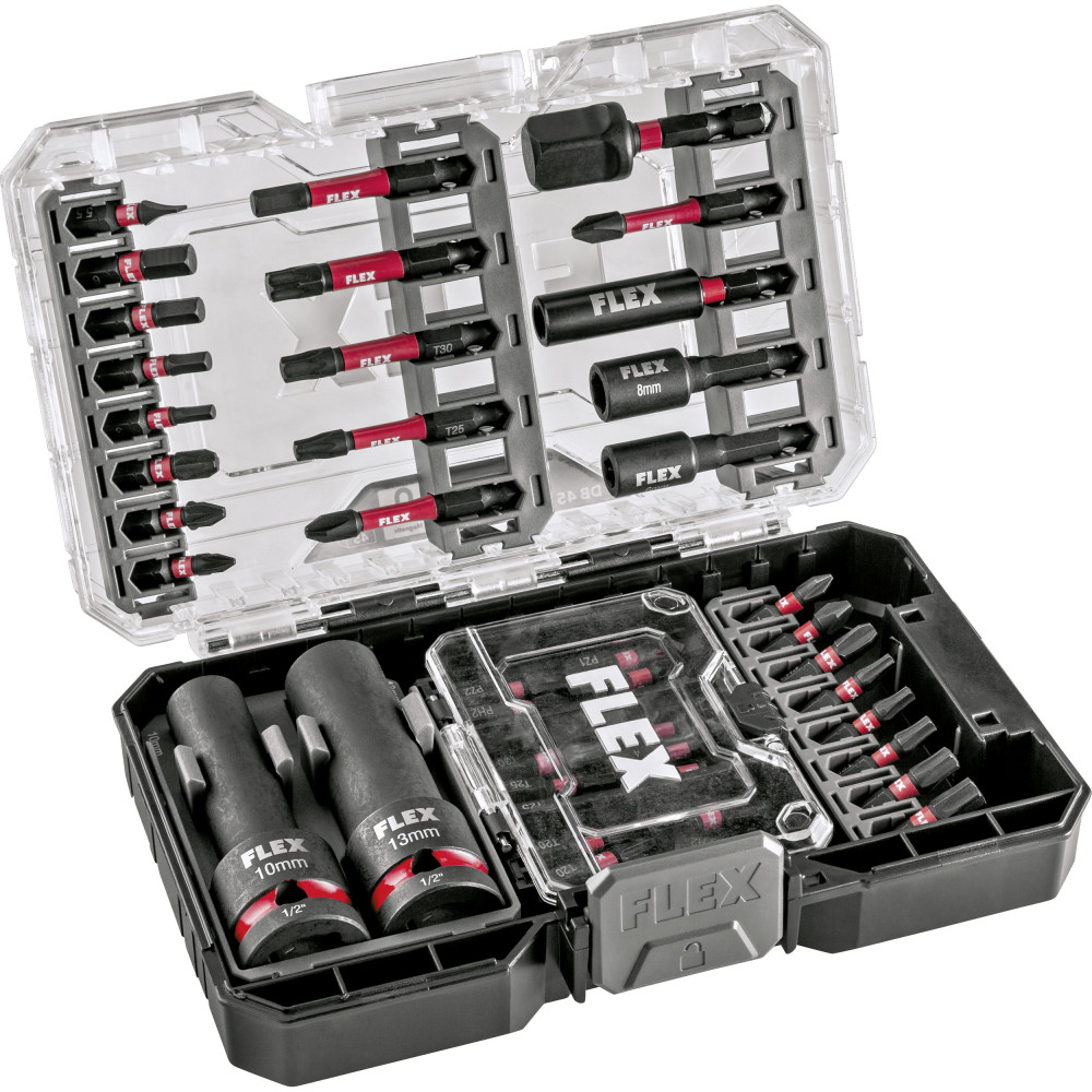 Praktická sada v nárazuvzdornom, uzamykateľnom boxe, s bočním zamykáním, stohovatelné. Bity, nástrčkové kľúče a rázové hlavice sú úhladne uložené a rýchlo po ruke.