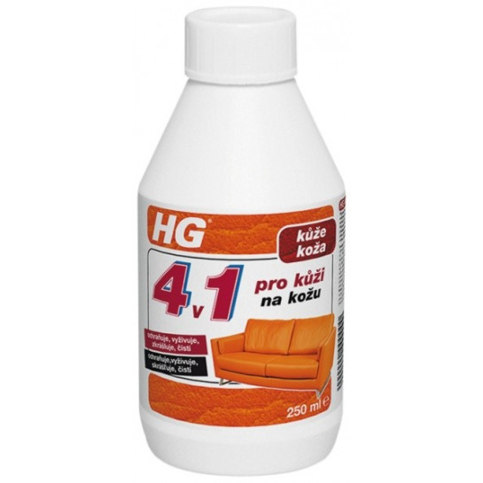 Prípravok HG 4 v 1 na kožu je špeciálne vyvinutý pre starostlivosť o anilínové a farebné druhy koží, ktoré sa používajú hlavne na nábytku, kufroch a taškách. Prípravok HG 4 v 1 na kožu je vyrobený na vodnej báze. Tento prípravok kožu čistí a vyživuje, vďaka čomu koža zostáva mäkká, pružná a perfektne chránená pred akoukoľvek špinou, škvrnami a potom. Naviac prípravok zvýrazní farbu a štruktúru kože.