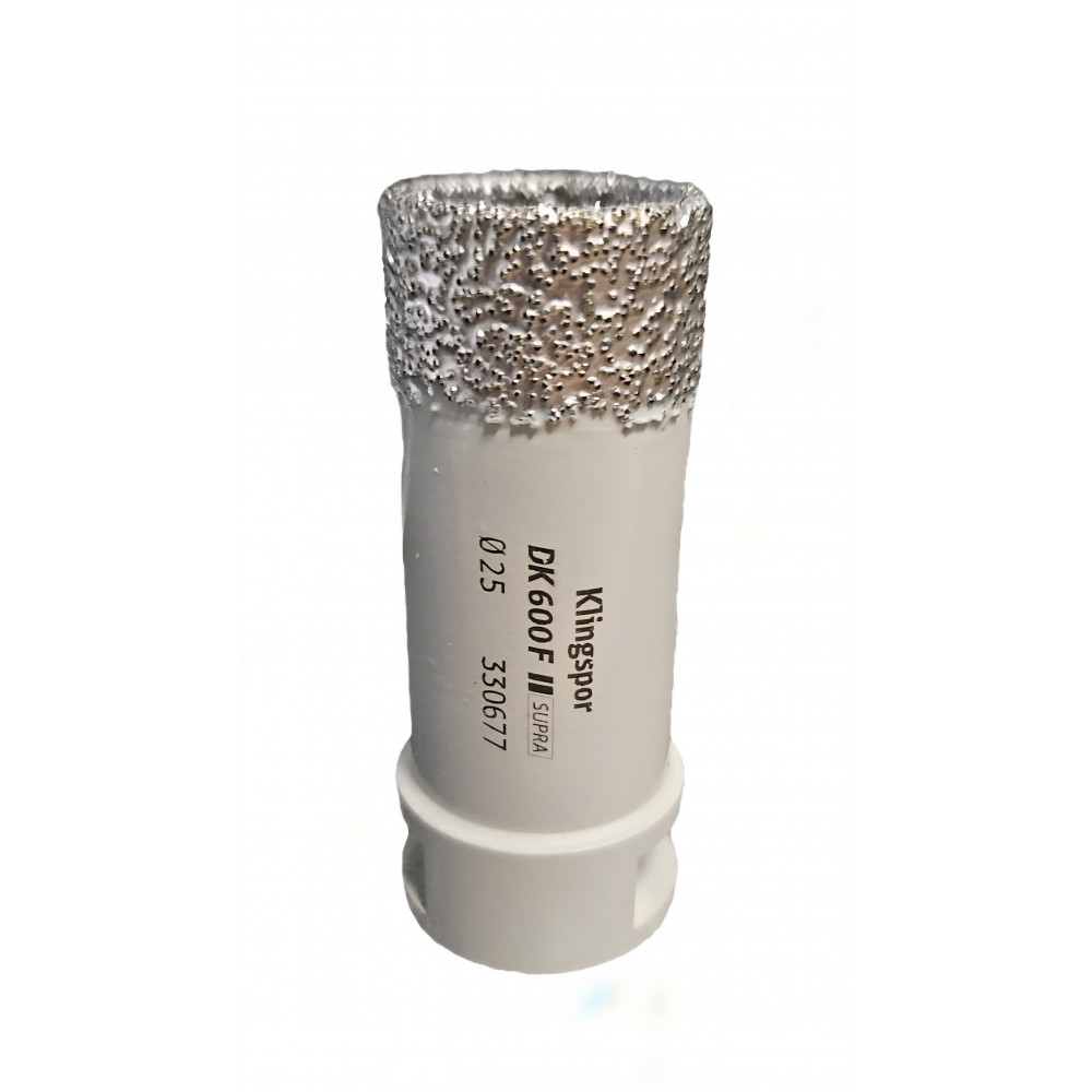 Na vŕtanie bez otrepov bez chladenia vodou: Suchý vrták DK 600 F Supra dokonale prerezáva kachličky, kachle alebo kameninu. Praskanie, lámanie alebo trieštenie kachličiek a kamenných dosiek je minulosťou. Maximálne prípustné otáčky sú 13 000 otáčok za minútu, čo zaisťuje rýchle a presné odstraňovanie materiálu. Výsledkom sú čisté hrany a presne vyvŕtané otvory. Suchý vrták DK 600 F Supra bol navrhnutý na použitie s uhlovými brúskami.