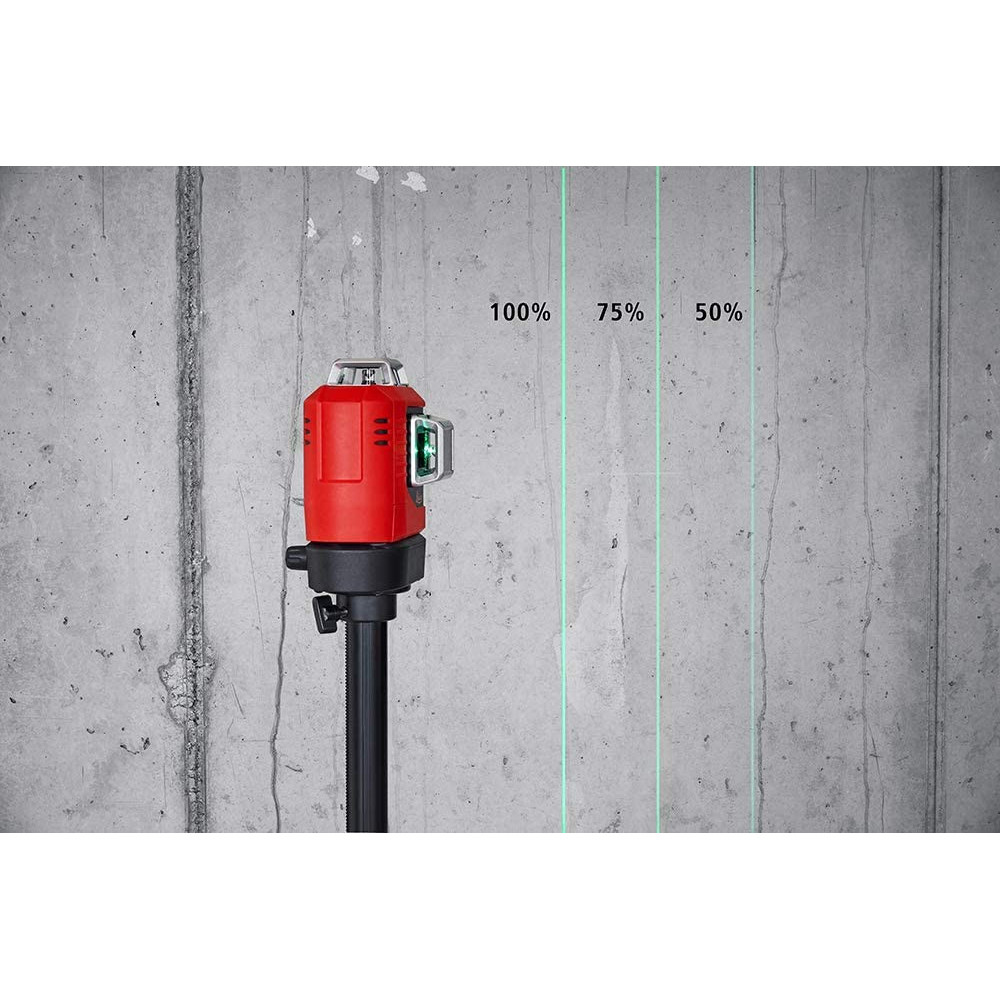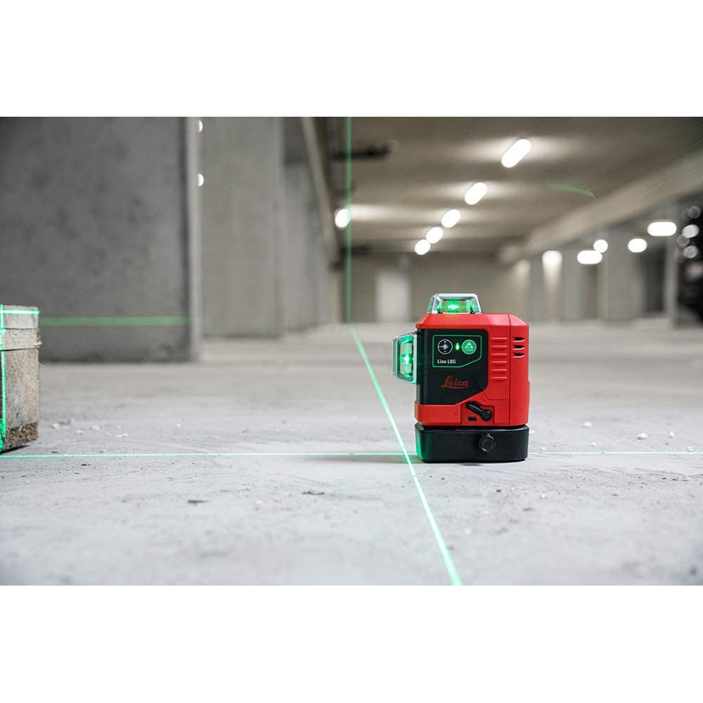 Švajčiarska optika Leica zaručuje, že laser LINO L6G má veľmi jasný a dobre viditeľný laserový lúč. 3x360 ° laserové čiary majú pracovný dosah až 35 metrov, v závislosti od svetelných podmienok. To znamená, že Lino L6G dosahuje projekcie laserových línií až do priemeru 70 metrov. Tento dosah je možné ľahko predĺžiť až na 140 metrov pomocou laserového prijímača RGR200. Sila laserových čiar je nastaviteľná (100/75/50 percent). To nielen robí zelené laserové čiary tenšími, ale tiež zvyšuje prevádzkovú dobu.