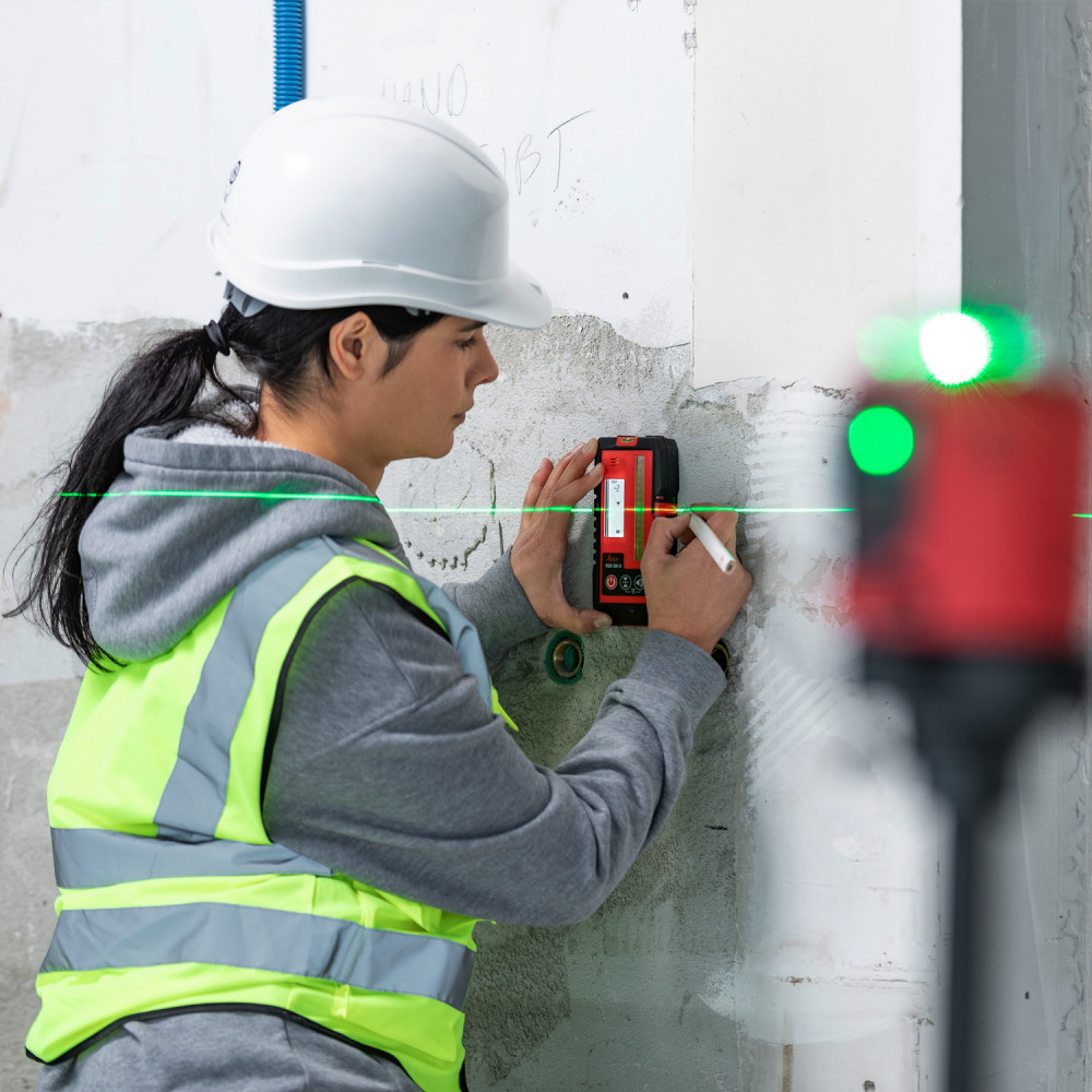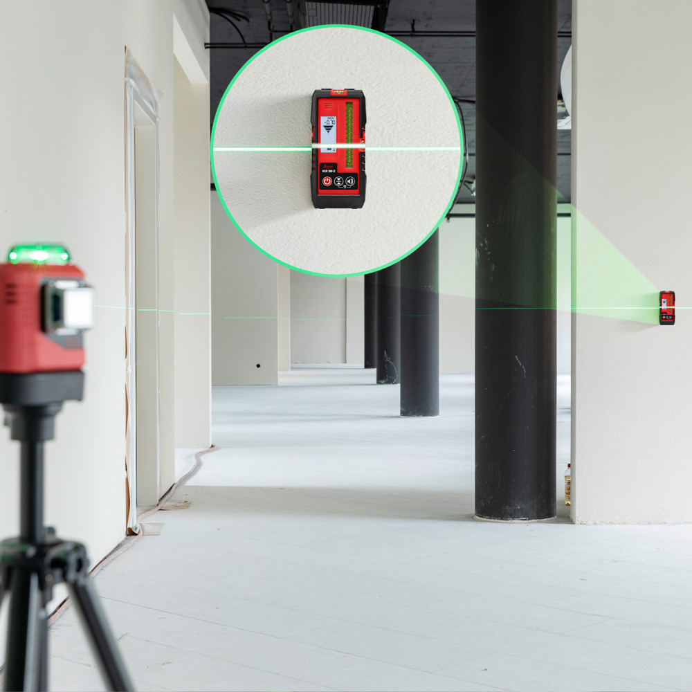 Prijímač využijete vo chvíli, keď potrebujete vytyčovať rovinu na priamom slnečnom svetle, kde je laserová čiara neviditeľná. Aby ste dokázali rýchlo a presne odčítať výšku laserovej línie, odporúčame prijímač umiestniť na nivelačnú latu s milimetrovou stupnicou. Prijímač umiestnite na latu, približne vo výške, kde by sa mal nachádzať lúč z krížového lasera.