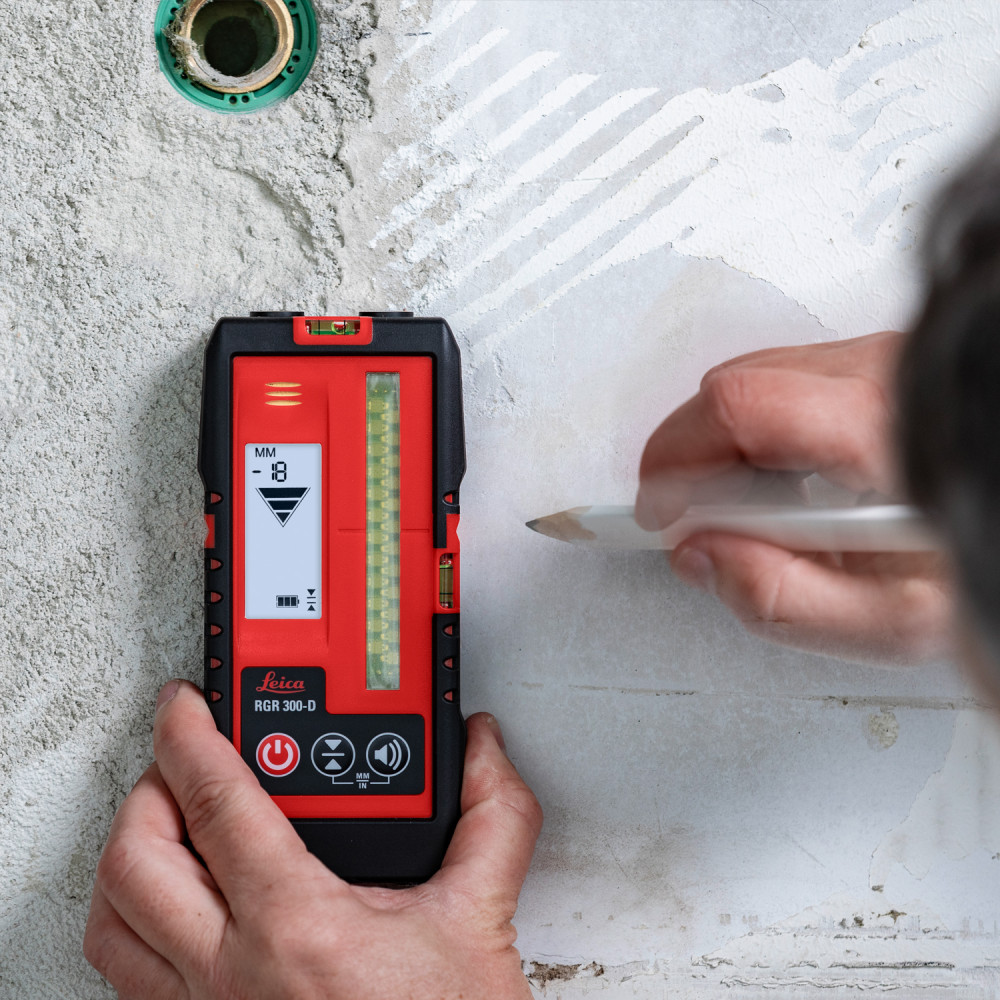 Leica RGR 300-D vás bude šípkami na obojstrannom displeji, ale aj akustickým signálom (pípanie) navádzať tak, aby ste dokázali stred prijímača umiestniť presne na úroveň laserovej čiary. V momente, keď stred prijímača dosiahne laserovú líniu, zmiznú z displeja šípky a pípanie sa zmení na súvislý tón. Stred prijímača, ktorý sa v tejto chvíli nachádza na laserovej čiare absolútne presne lícuje s ryskami po bokoch prístroja, pomocou ktorých dokážete z nivelačnej laty presne odčítať aktuálnu výšku bodu, na ktorom sa nachádzate.