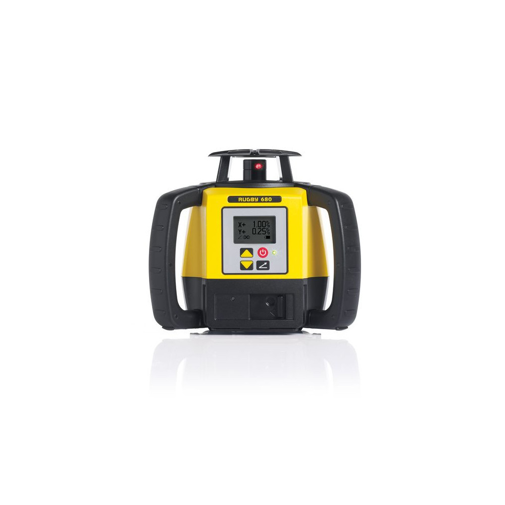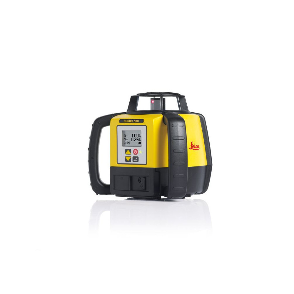 Leica RUGBY 680 je horizontálny rotačný laser s presnosťou nivelácie ±1.5 mm na 30 m, dosahom 600 m, umožňuje digitálne nastavovať sklony v dvoch osiach, má odolnosť IP67, na nabitie vydrží pracovať až 40 hodín.