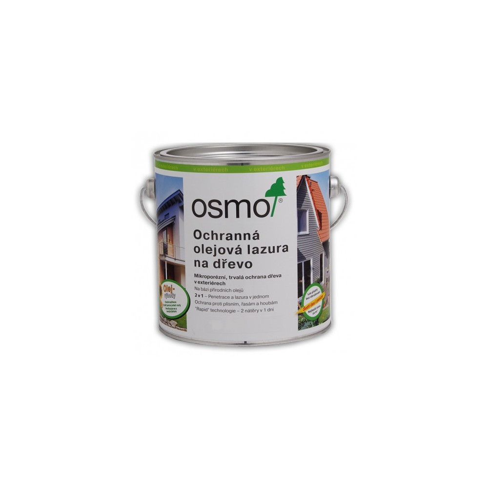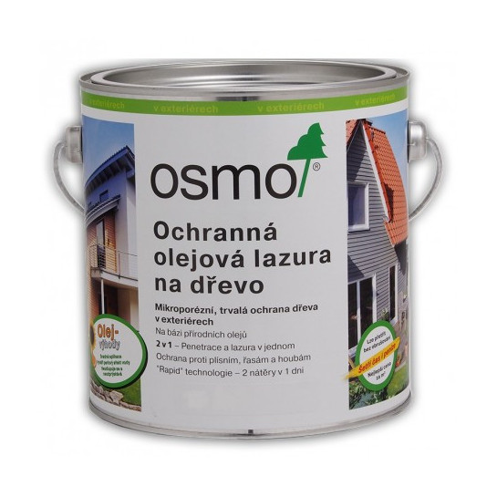 OSMO Ochranná olejová lazúra je dekoratívny, transparentný polomatný náter na drevo vhodný pre exteriér. Predstavuje dlhodobú ochranu na báze oleja (penetrácia + lazúra). náter nepraská a neodlupuje sa. Je vodoodolný a extrémne odolný voči poveternostným podmienkam. Oživenie náteru sa prevedie jednoduchým pretrením (žiadne základovanie a prebrusovanie – žiadny jemný prach). Povrchová úprava obsahuje účinné zložky na preventívnu ochranu proti plesniam, riasam a hubám a po desaťročia sa osvedčila v extrémnych klimatických podmienkach.