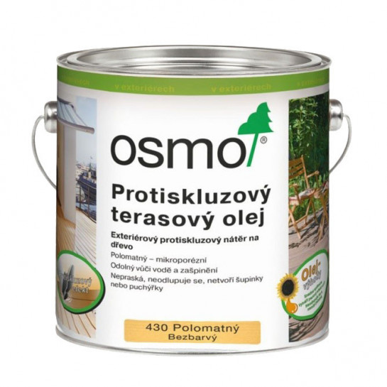 Osmo protišmykový terasový olej je polomatný konečný náter na terasové drevo alebo iné drevené plochy už pred tým ošetrené Osmo pigmentovaným olejom. Obsahuje špeciálne, vysoko zahustené organické protišmykové prísady, ktoré sú rovnomerne rozdelené v nátere a po uschnutí pôsobia protišmykovo, s účinnosťou R10.