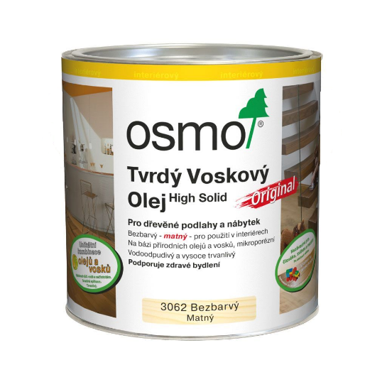 Osmo Tvrdý voskový olej je bezfarebný náter určený na ošetrenie všetkých typov drevených podláh, dosiek OSB podľa DIN 18356 a nábytku. Je vhodný aj na korkové podlahy a vďaka svojej priľnavosti aj na neglazúrované dlaždice. Osmo Tvrdý voskový olej Originál je vodoodpudivý a oderu odolný a vytvára na dotyk príjemný povrch. Jednoduchá aplikácia bez základovania a šetrí čas aj peniaze. Je vyrobený na báze prírodných rastlinných olejov, nepraská, neolupuje sa. Odpudzuje vodu, nenáchylný k zašpineniu, odolný proti ošľapávaniu. Osmo Tvrdý voskový olej Originál je odolný voči vínu, pivu, kolovým nápojom, káve, čaji, ovocnej šťave, mlieku a vode; podľa DIN 68861-1A. Suchý povrch je bezpečný pre ľudí, zvieratá a rastliny podľa DIN 53 160. Náter je vhodný pre detské hračky EN 71.3.