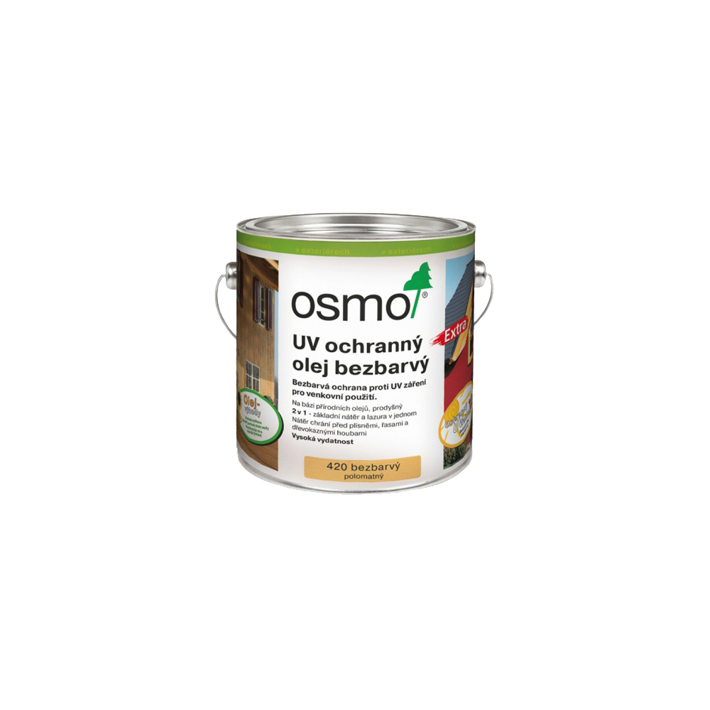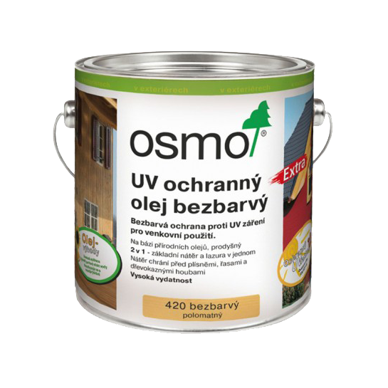 Osmo UV ochranný olej je polomatný, bezfarebný náter na drevo do vonkajšieho prostredia s mimoriadne mnohostrannými možnosťami využitia. Náter nepraská a neodlupuje sa. Ako konečný náter na už upravené drevo, OSMO UV ochranný olej bezfarebný 420 výrazne predlžuje interval renovácie. Ako samostatný náter zamedzuje procesu šednutia ochranným UV faktorom 12 v porovnaní s drevom bez úpravy. Osmo UV Ochranný olej je vybavený aktívnymi prísadami proti plesniam, riasam a hubám. Oživenie náteru sa prevedie jednoduchým pretrením (žiadne prebrusovanie – žiadny jemný prach).