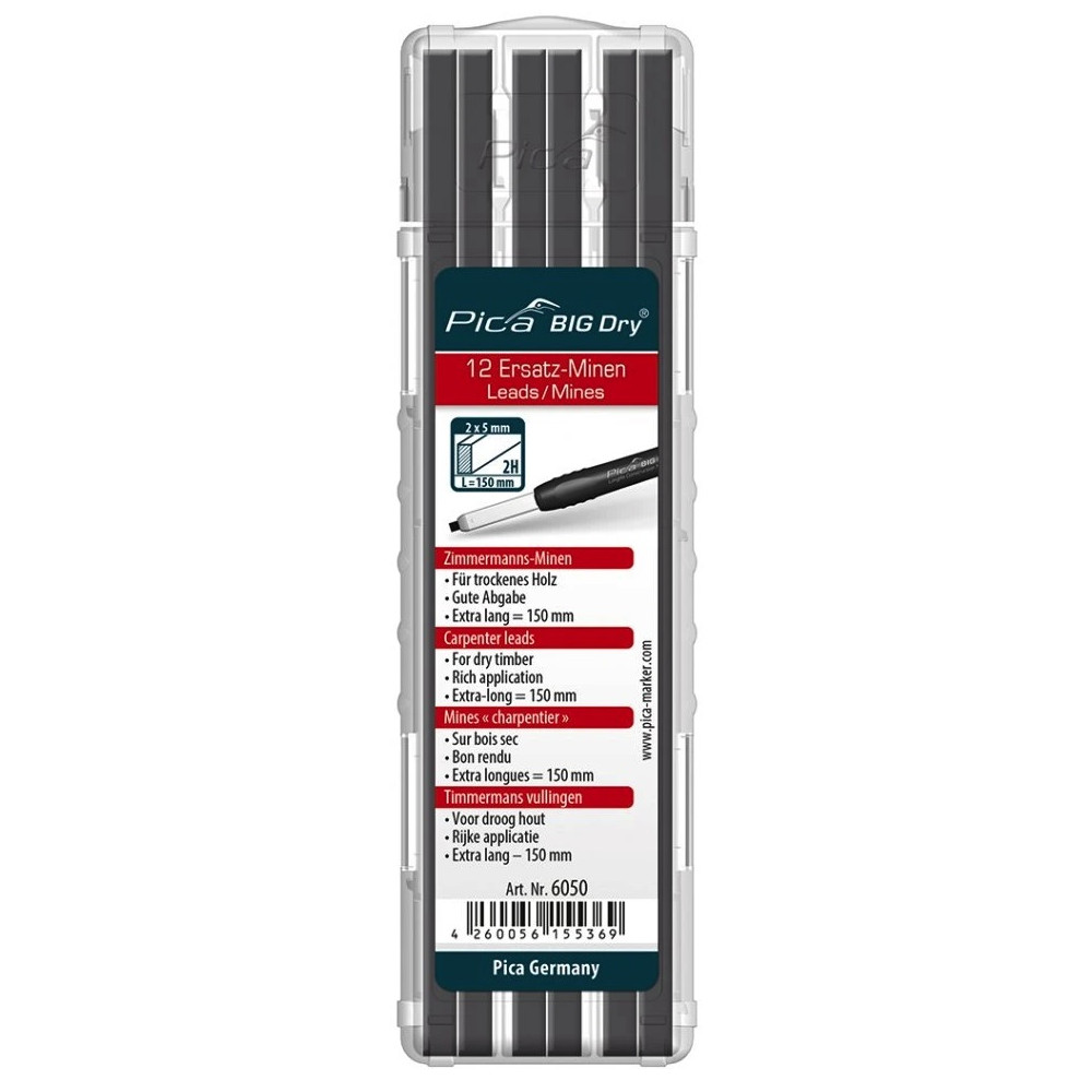 Univerzálna náplň do stolárskej ceruzky Pica BIG Dry. Vodou rozpustiteľná - zotriete ju vlhkou handričkou. V obojstranne rozložiteľnom boxe nájdete celkom 12 kusov.