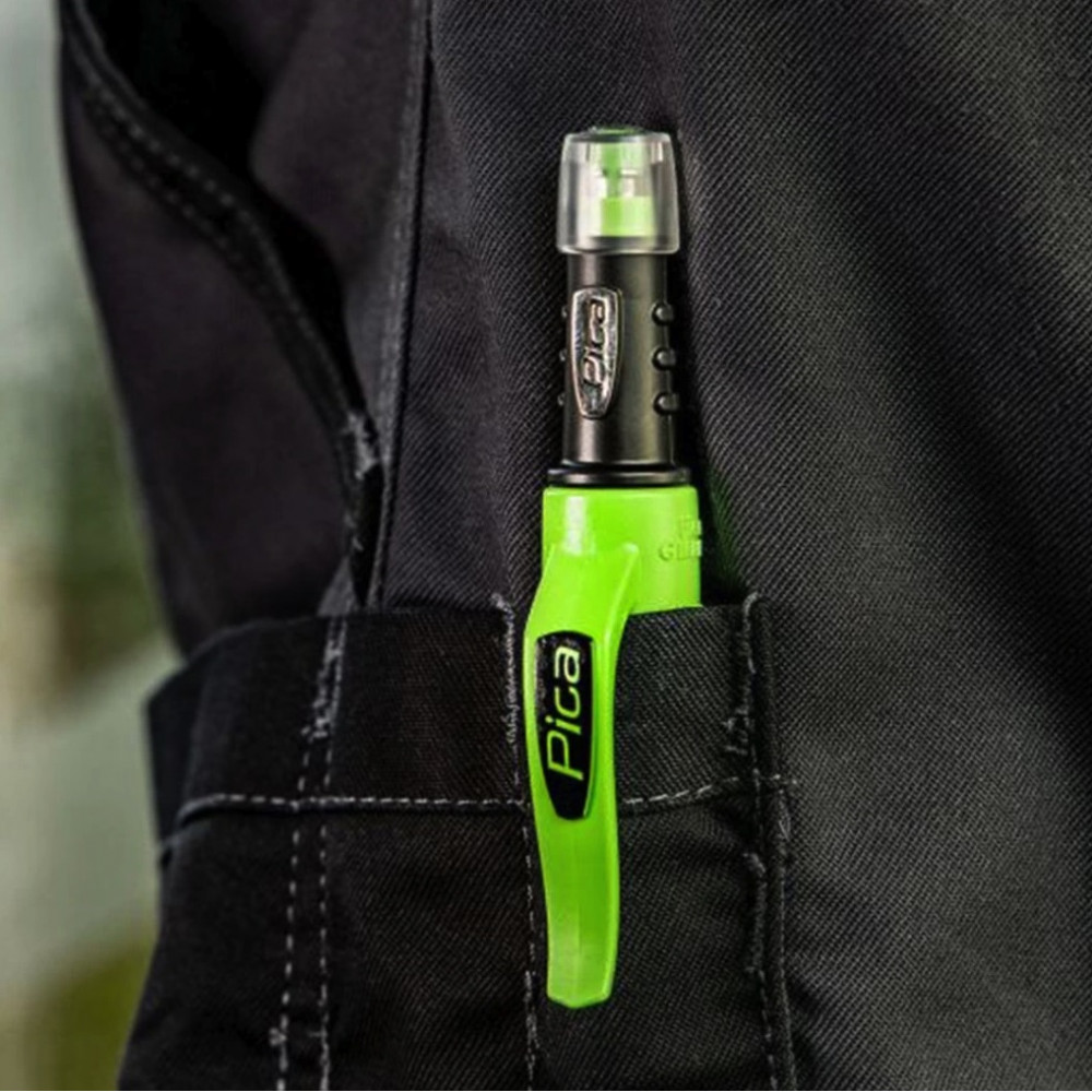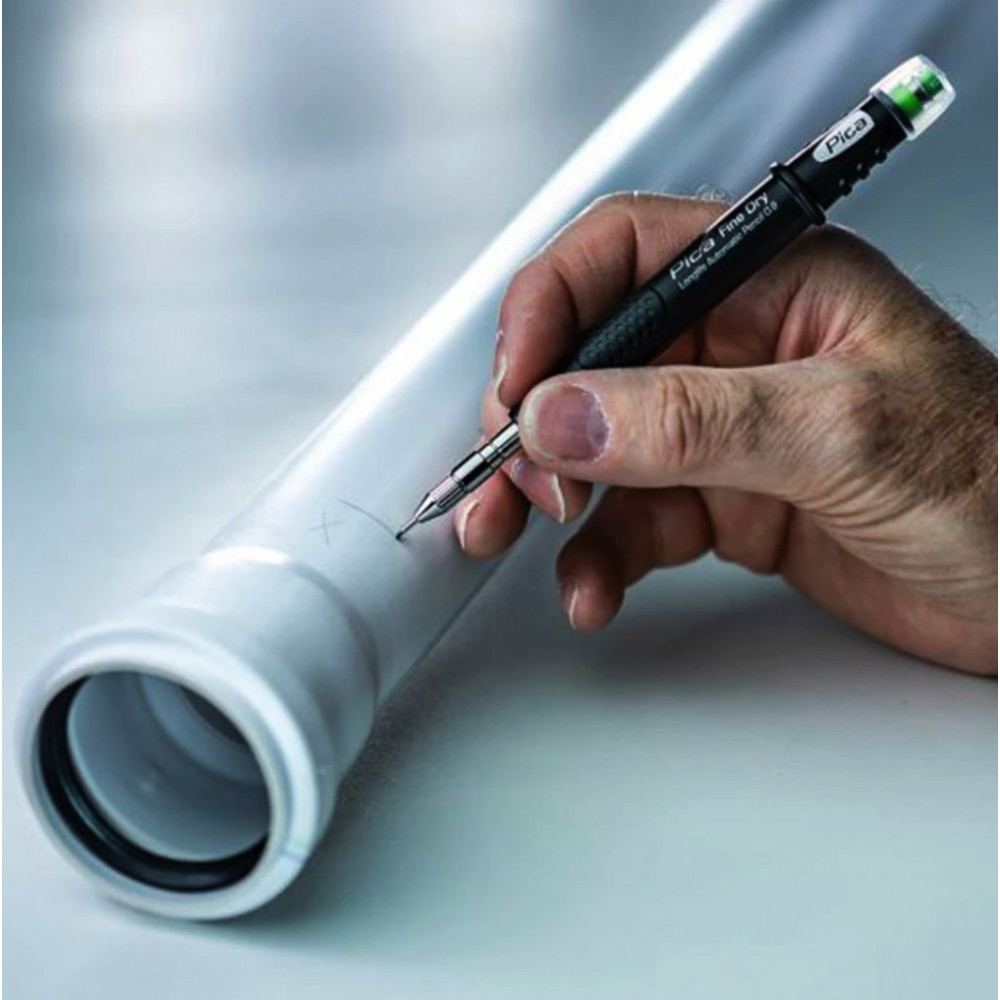 Remeselnícka mikroceruzka Fine Dry od nemeckej značky PICA pre naozaj presné a precízne značenie. Špičkový tlačiaci mechanizmus z nerezovej ocele posúva tuhu do hrotu automaticky. Priemer hrotu a tuhy iba 0,9 mm. Píše na takmer všetky druhy povrchov. Vymeniteľné tuhy. So zabudovanou gumou na opravu značenia. Tlačidlo posunu tuhy má tvar obráteného dáždnika, takže sa žiadny prach a voda nedostanú dovnútra konštrukcie ceruzky. Viečko s háčikom slúži zároveň ako puzdro a vďaka nemu budete mať ceruzku vždy po ruke.