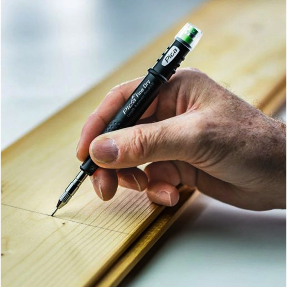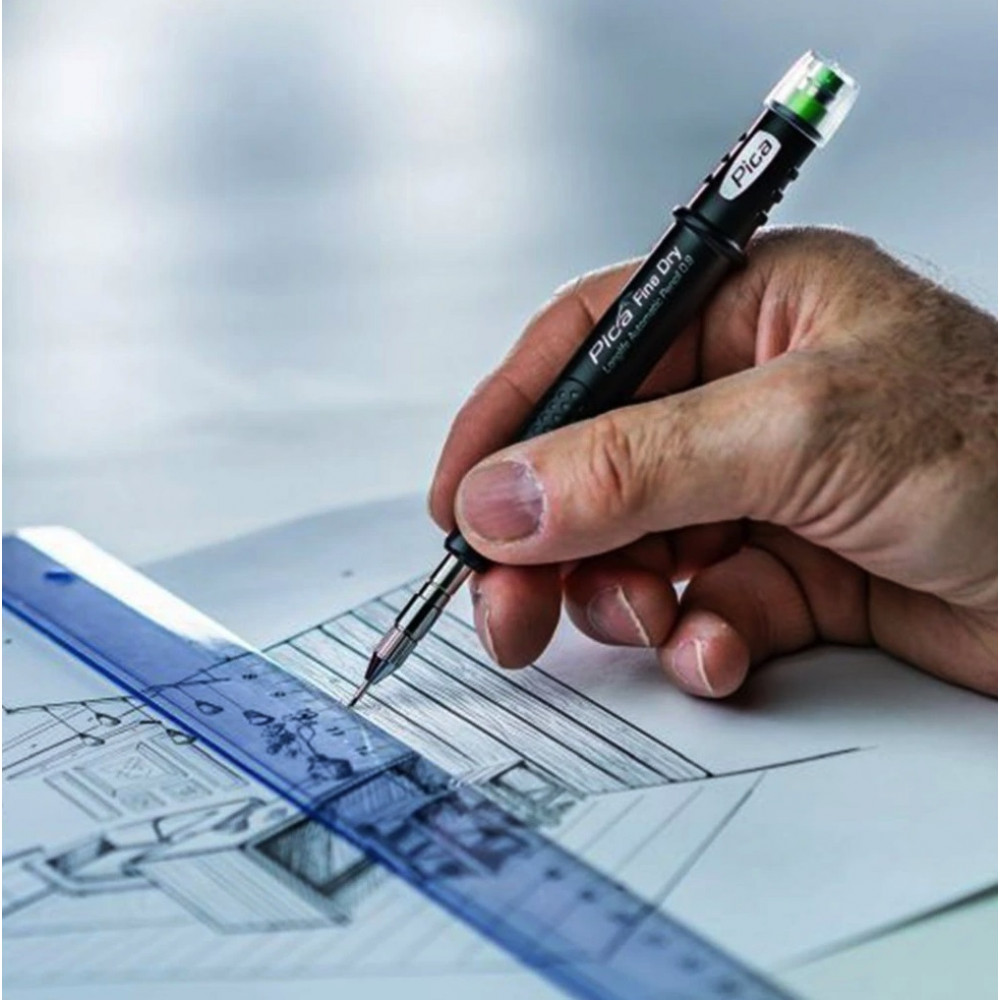 Remeselnícka mikroceruzka Fine Dry od nemeckej značky PICA pre naozaj presné a precízne značenie. Špičkový tlačiaci mechanizmus z nerezovej ocele posúva tuhu do hrotu automaticky. Priemer hrotu a tuhy iba 0,9 mm. Píše na takmer všetky druhy povrchov. Vymeniteľné tuhy. So zabudovanou gumou na opravu značenia. Tlačidlo posunu tuhy má tvar obráteného dáždnika, takže sa žiadny prach a voda nedostanú dovnútra konštrukcie ceruzky. Viečko s háčikom slúži zároveň ako puzdro a vďaka nemu budete mať ceruzku vždy po ruke.