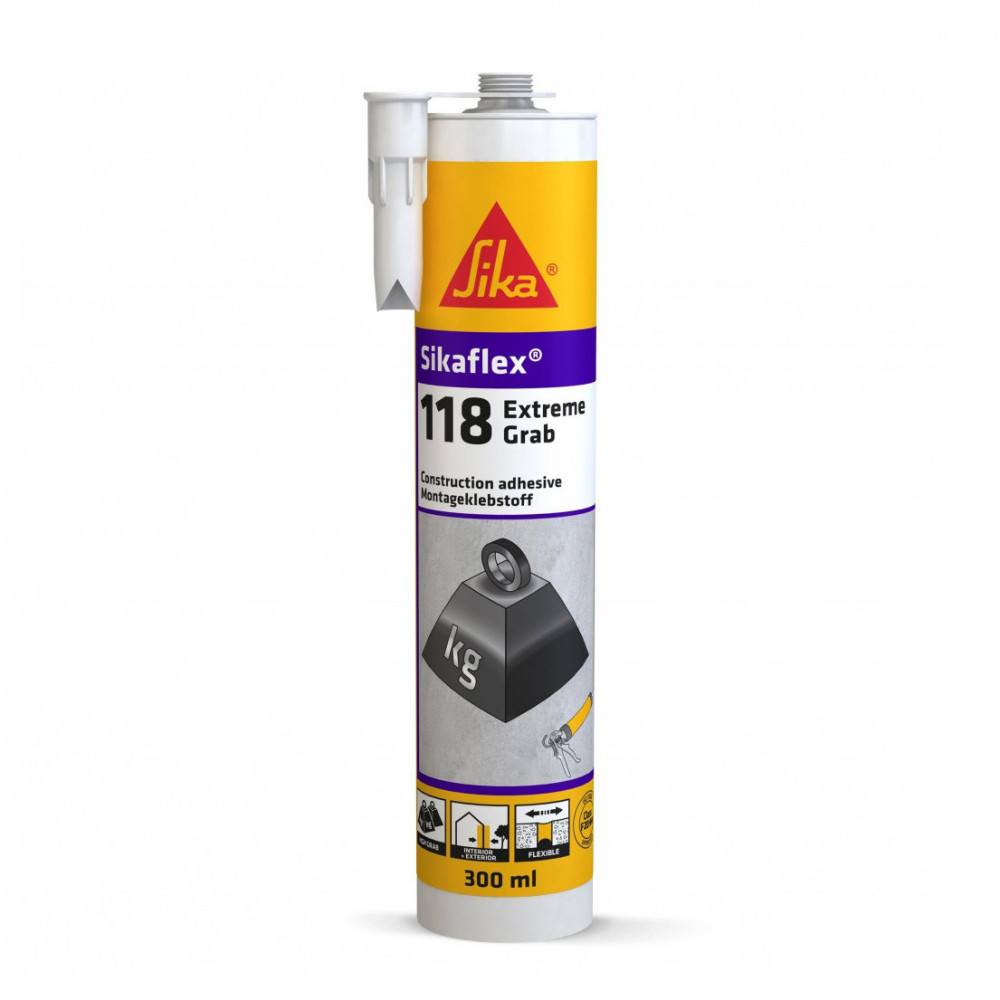 Použitie: Sikaflex®-118 Extreme Grab je vyvinutý na lepenie rôznych materiálov v interiéroch aj exteriéroch, ako sú napr. kameň, tehla, okenné a dverné rámy, zrkadlá, drevené trámy a ťažké diely a lišty. Sikaflex®-118 Extreme Grab je vyvinutý na lepenie betónu, malty, prírodného kameňa, tehly, vláknocementu, keramiky, dreva a kovov.