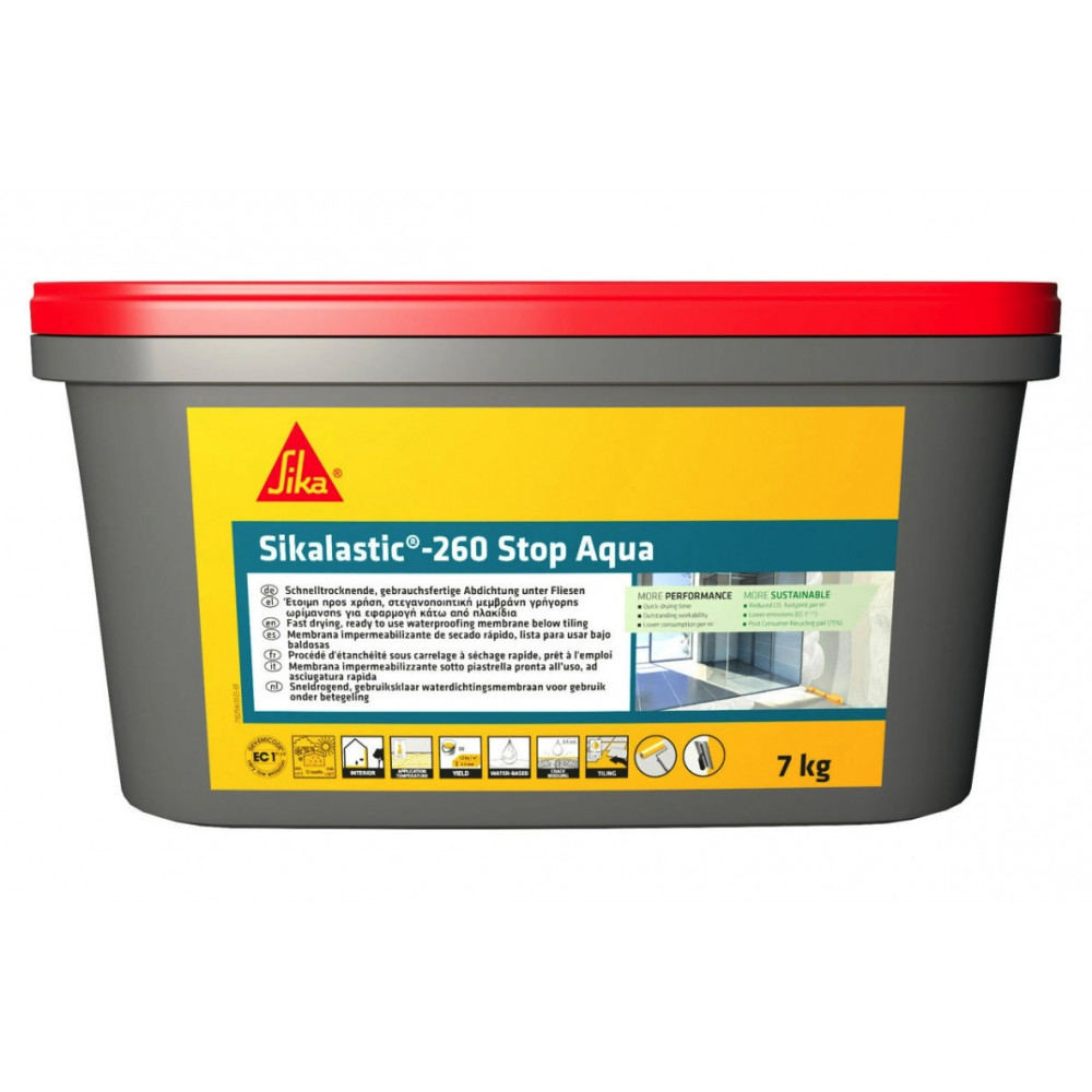 Sikalastic®-260 Stop Aqua je 1-komponentná vrstva na báze živice, aplikovaná v tekutom stave, určená do vlhkých priestorov, pripravená na aplikáciu. Výrobok zaisťuje plnohodnotnú hydroizolačnú vrstvu pripravenú na aplikáciu obkladov a dlažieb.