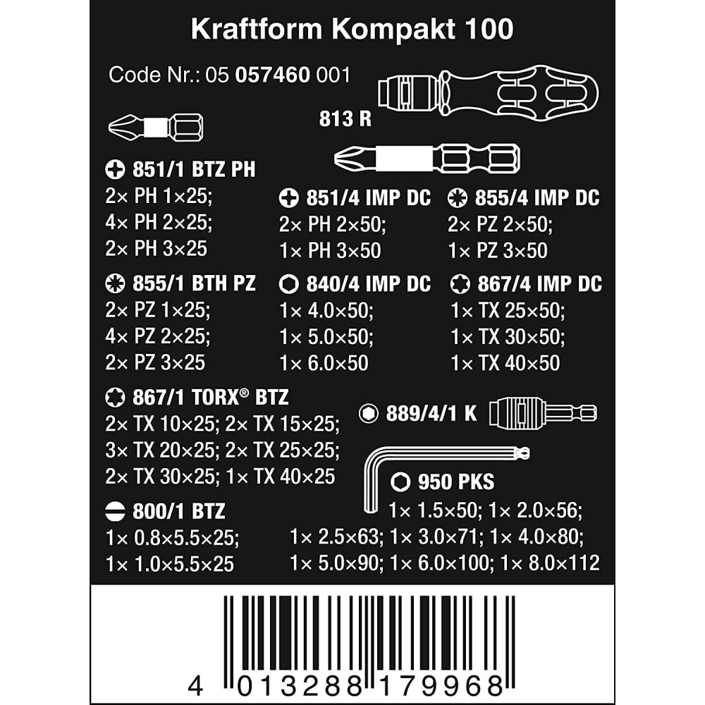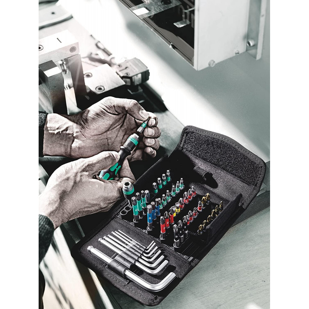 Kompaktná sada náradia s 52 skrutkovacími nástrojmi. 1 držiak bitov Rapidaptor s rýchloupínacím skľučovadlom; 1 držiak bitov Rapidaptor B s rýchloupínacím skľučovadlom na upevnenie do skrutkovača alebo na použitie v skľučovadle elektrickej vŕtačky; 30 bitov BiTorsion, dĺžka 25 mm pre dlhú životnosť, odolné a tvrdé (BTZ), na univerzálne použitie, extra tvrdé (BTH); 12 bitov Impaktor, dĺžka 50 mm pre obzvlášť vysoké nároky; 8 úhlových kľúčov s profilom Hex-Plus (zabraňuje zaobleniu imbusových skrutiek) a šesťhrannou guľovou hlavou na dlhej nohe pre prácu pod uhlom; extrémne robustná a odolná textilná krabica; možnosť umiestnenia vo zvislej polohe pre prehľadné uskladnenie na dielenskej polici; dodatočná ochrana povrchu vďaka textilnému vonkajšiemu materiálu.