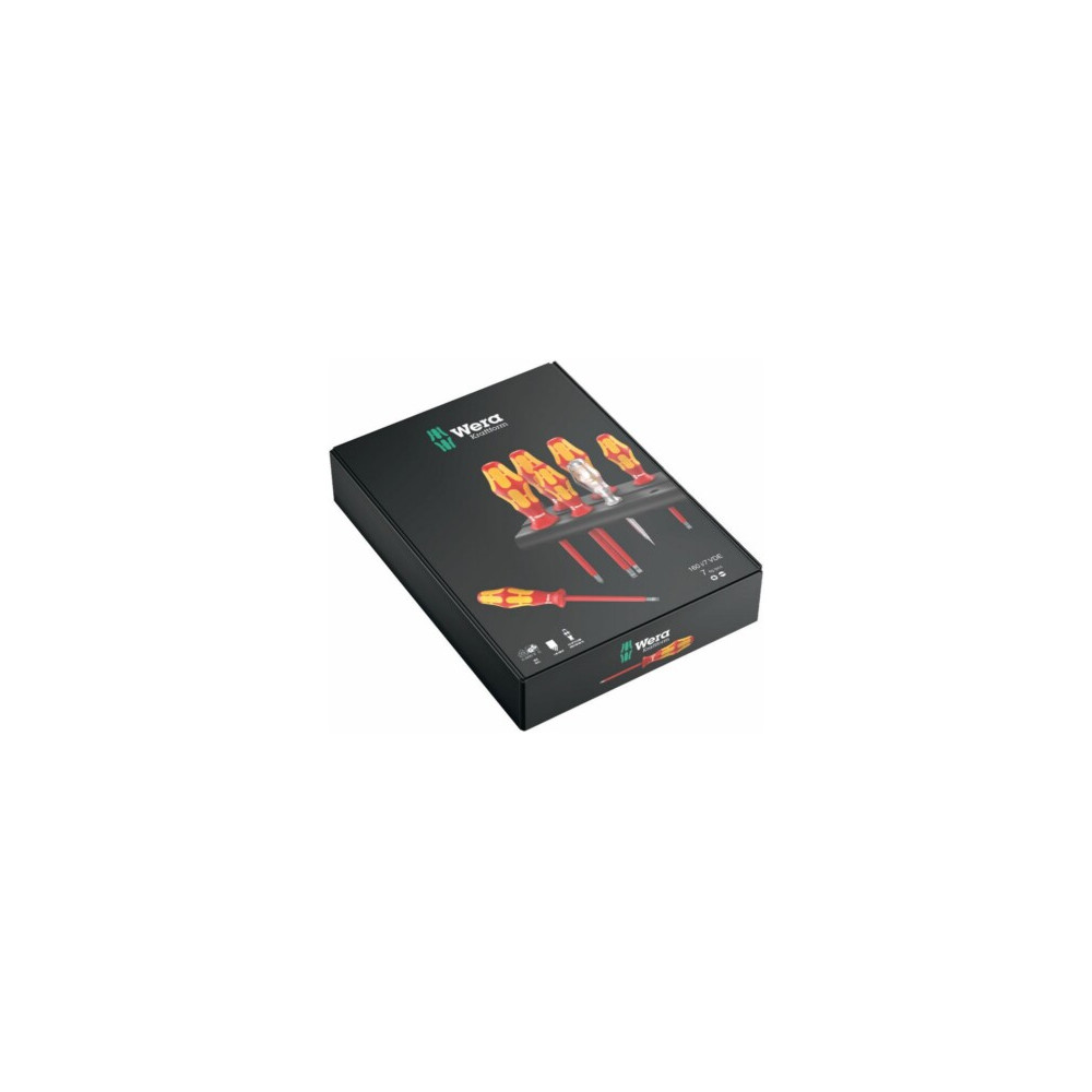 7-dielna súprava skrutkovačov s individuálne testovanými izolovanými skrutkovačmi podľa IEC 60900. Rutinná skúška vo vodnom kúpeli pri 10 000 V na bezpečnú prácu pri schválenom napätí 1 000 V. Rukoväť Kraftform Plus pre príjemne ergonomickú prácu, ktorá zabraňuje pľuzgierom a mozole. Tvrdé úchopové zóny pre vysokú pracovnú rýchlosť, zatiaľ čo mäkké úchopové zóny zaručujú vysoký prenos krútiaceho momentu. Ochrana proti samovoľnému pohybu zabraňuje nepríjemnému pohybu na pracovisku. Čiastočne laserová špička: Špička zachytí hlavu skrutky a zabráni jej skĺznutiu. Vrátane testera napätia a 1 stojana na uloženie.
